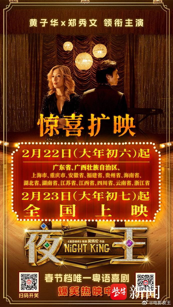昨天下午,@电影夜王官宣,2月22日起,除两广之外,惊喜扩映至上海、江苏等地,并于2月23日(大年初七),全国相见。