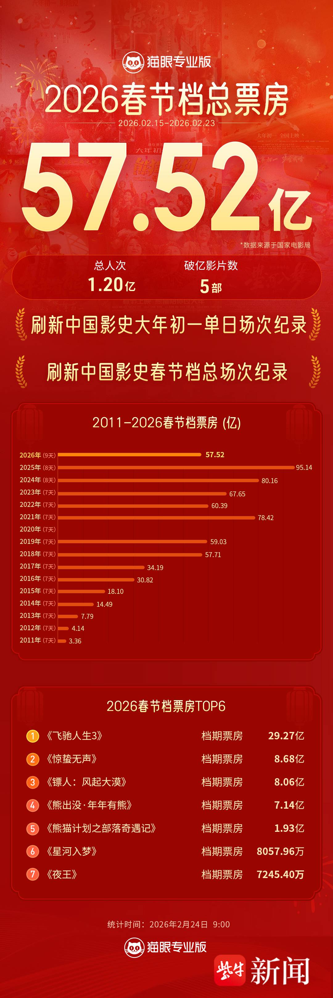 据国家电影局数据显示,2026年春节档(2.15-2.23)总票房达57.52亿。