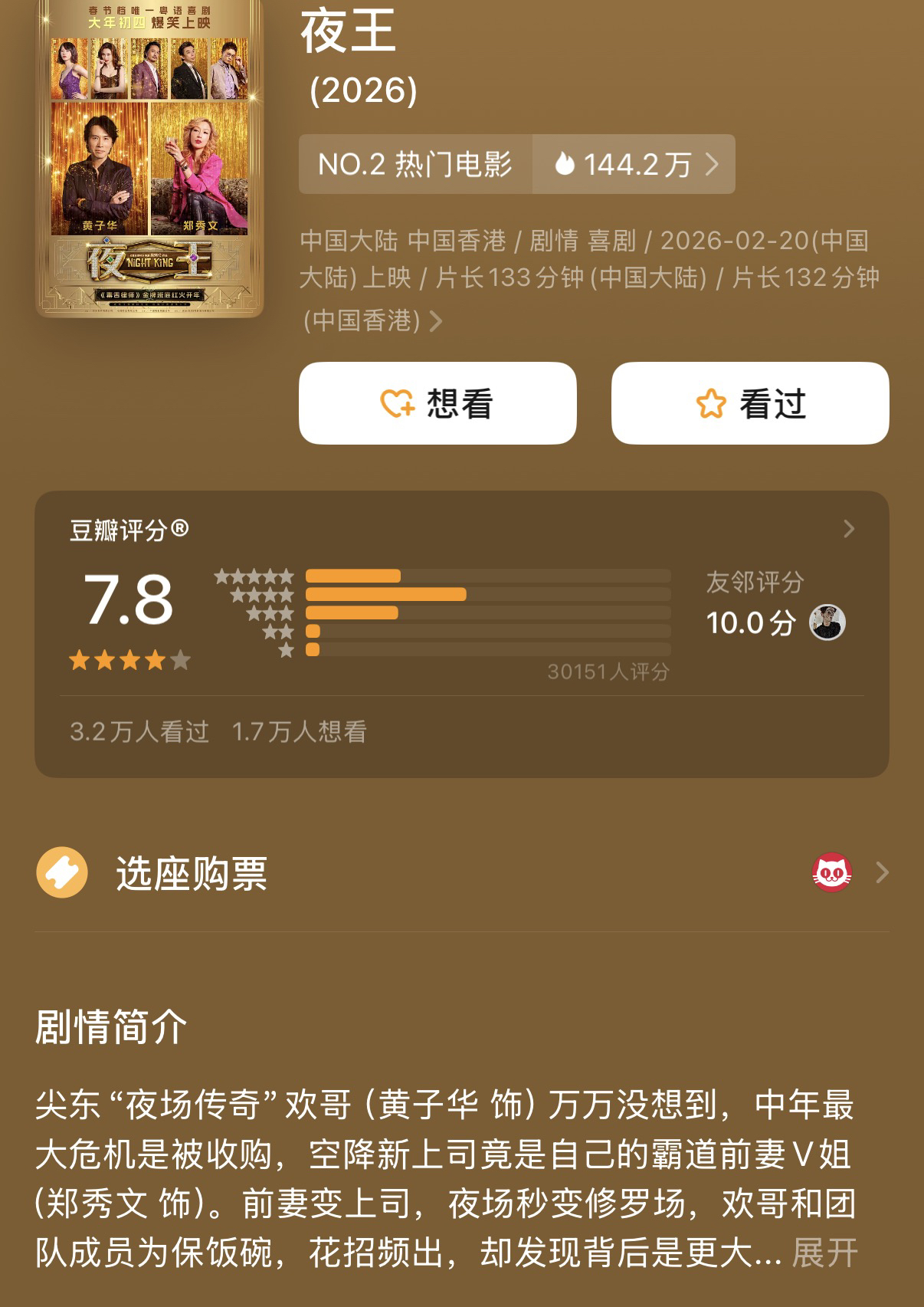 在刚刚过去的2026年春节档,一部“小众”粤语喜剧电影的入场带来了不小的惊喜。由黄子华、郑秀文主演的《夜王》,在“两广限定”上映后,凭借观众口口相传,闯出一条逆袭之路。截至2月24日,该片豆瓣开分高达7.8分,一举登顶春节档新片口碑榜。