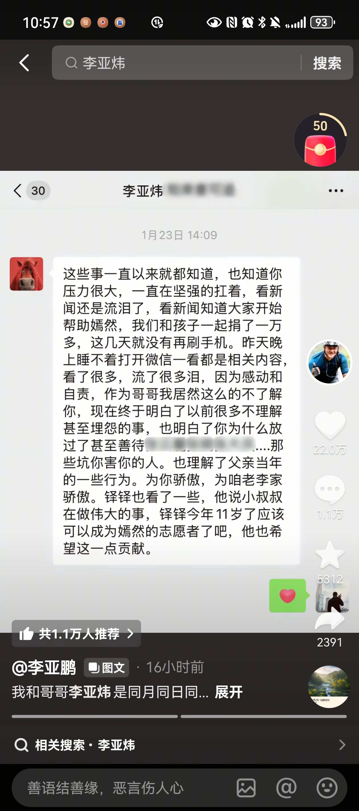 哥哥在文中坦言曾因不理解李亚鹏的坚持心生埋怨,却在嫣然基金相关风波中,被其坚守慈善16年的初心打动,不仅主动捐款万余元,还带动11岁的儿子成为嫣然志愿者,彻底化解多年心结。“昨天晚上睡不着,打开微信一看都是相关内容,看了很多,流了很多泪,因为感动和自责,作为哥哥我居然这么的不了解你,现在终于明白了以前很多不理解甚至埋怨的事……为你骄傲,为咱老李家骄傲。”
