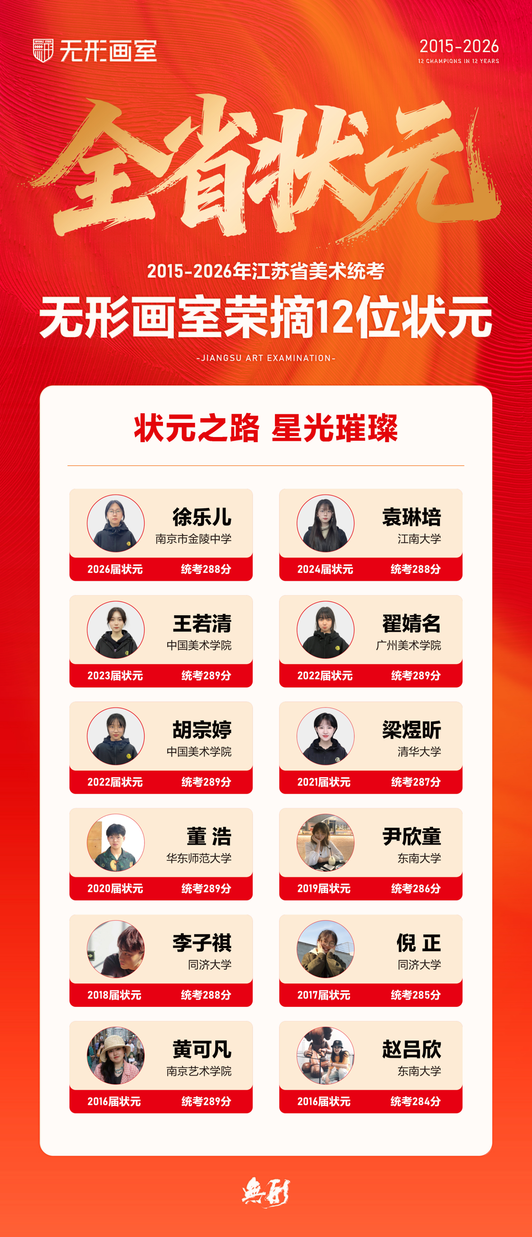 2014年是无形画室发展史上的里程碑。这一年,江苏新路艺术正式注册成立,画室走上规模化、品牌化运营的快车道。也是在这一年,无形画室的学生一举摘得江苏省美术统考第一名和第二名,优异的成绩如同一声号角,宣告了其在江苏艺考领域的强势崛起。此后,佳绩频传,从2015年到2026年,无形画室创下了 “十二年十二冠” 的传奇,累计培养江苏省美术统考状元12席、全省前三名38人、全省前十名85人。一次的好成绩或许是运气,但跨越十余年的持续领跑,背后无疑是雄厚实力与深厚底蕴的有力支撑。