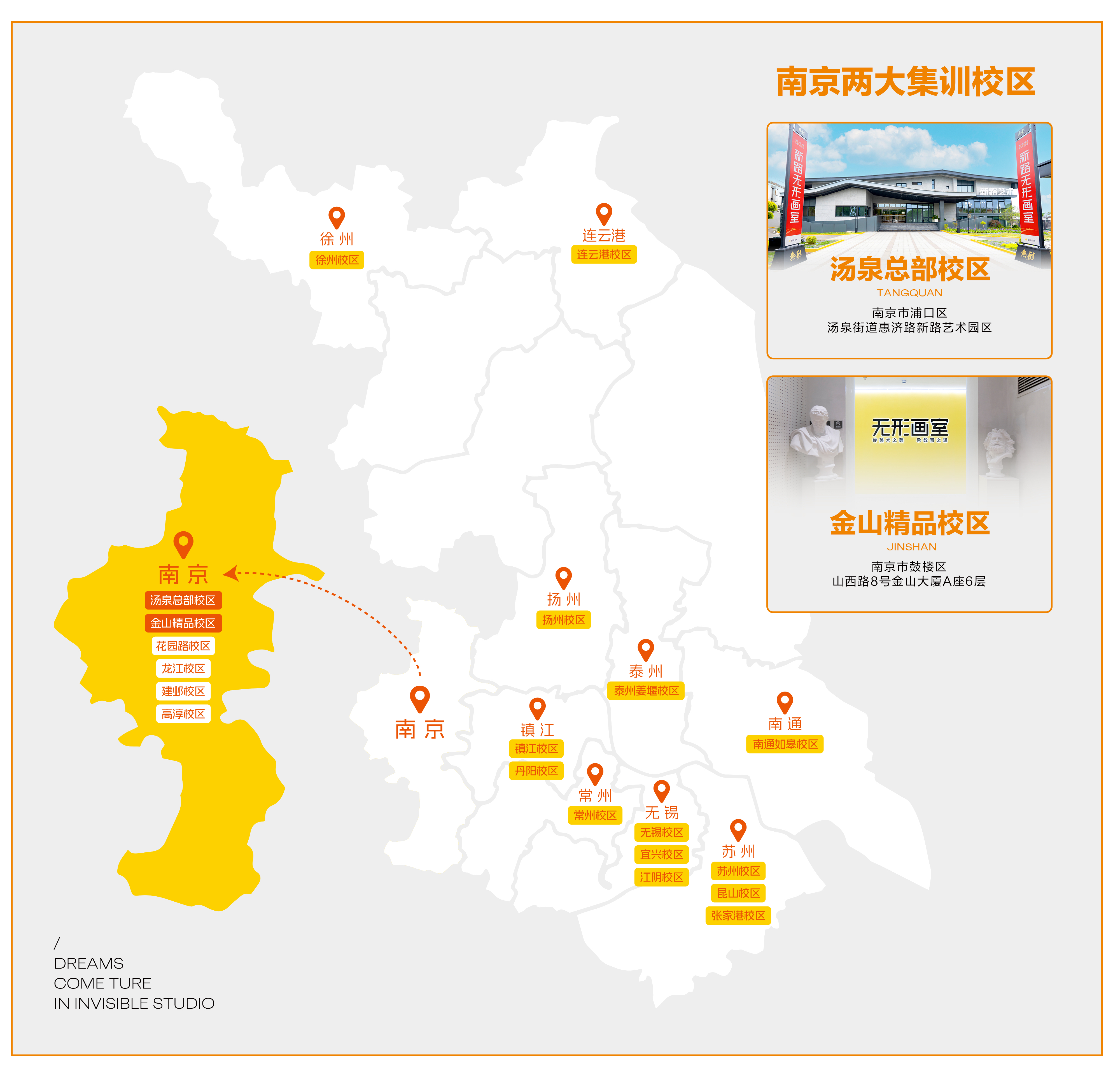 如今,无形画室已构建起覆盖全省的完善教学矩阵。2023年,南京汤泉自建校区的落成,标志着画室发展进入新阶段。在继续深耕南京教育的同时,画室布局省内20个直营校区,形成了 “集训核心 + 基础覆盖” 的协同发展模式: