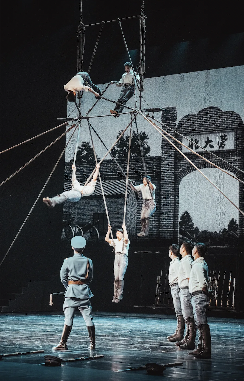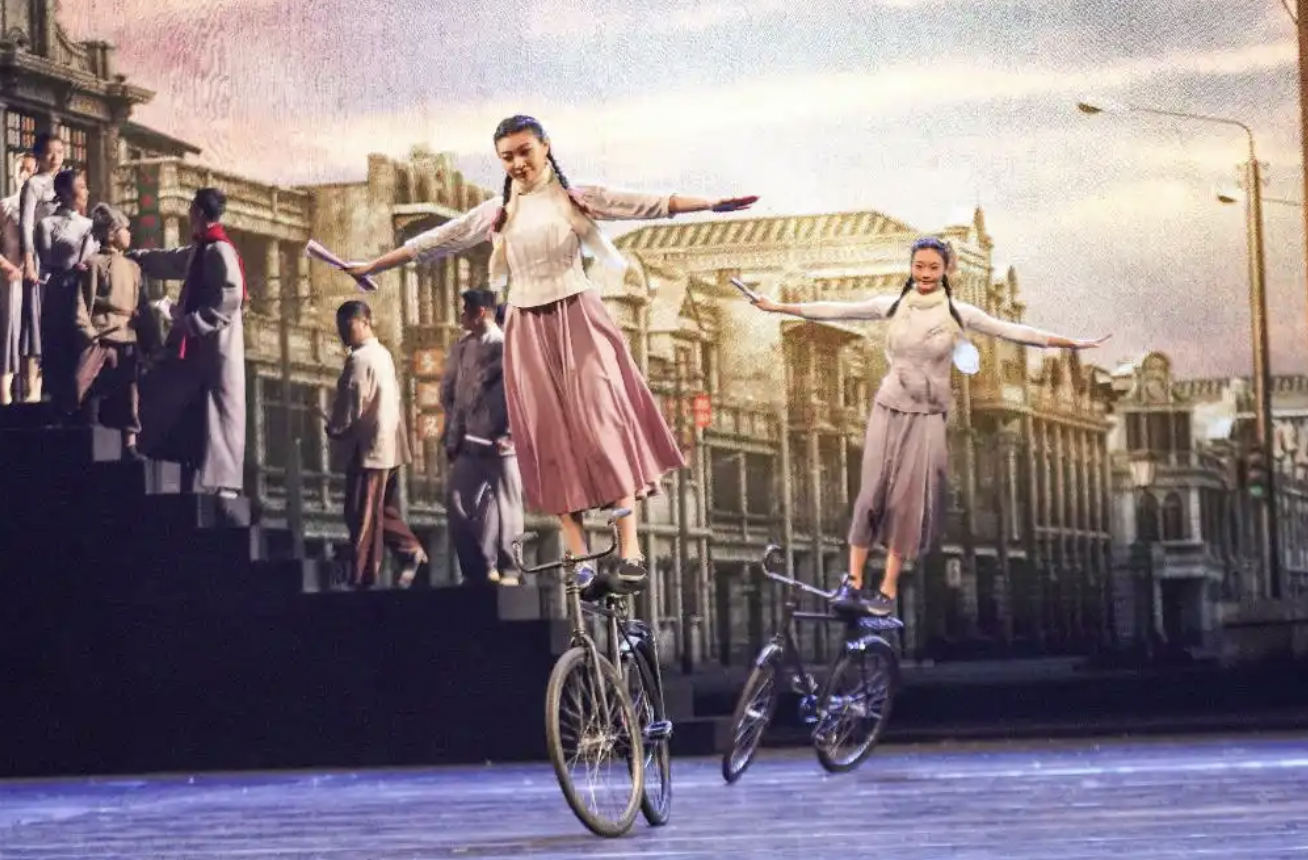 《集体爬杆》中以演员挺拔向上的姿态再现抗日战士冲锋陷阵的壮烈;《高空网吊》借肢体柔术技巧传递家园沦陷的悲怆与对信仰的坚守;《集体车技》则用疾驰车轮隐喻救亡图存的急迫。每一项技艺都不再是孤立的技巧展示,而是推动剧情、传递情感的“叙事语言”,实现了“技”与“情”的统一。