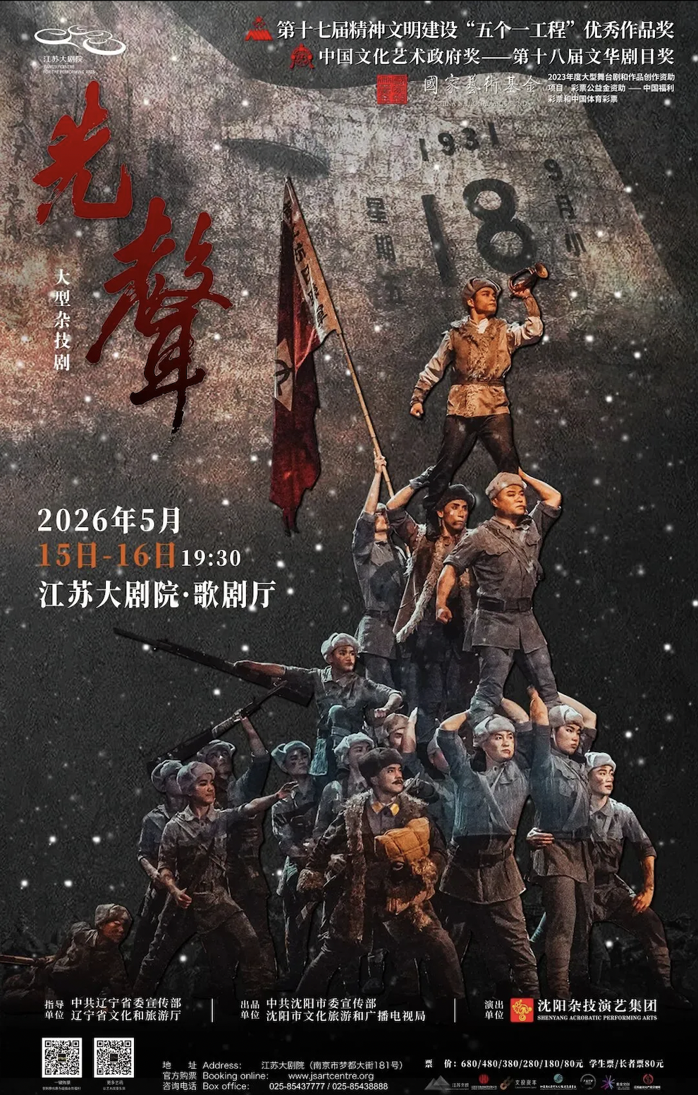 由沈阳杂技演艺集团创演的《先声》,已斩获中宣部第十七届精神文明建设“五个一工程”优秀作品奖、第十八届文华剧目奖“双料”国家级最高荣誉,南京是该剧2026全国巡演的第一站。