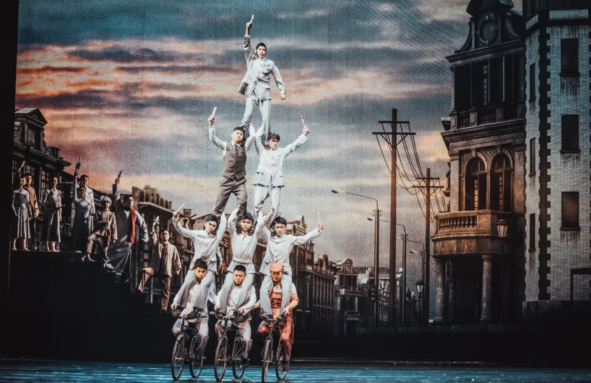 在艺术呈现上,《先声》打破了传统杂技单纯追求技巧展示的局限,将舞狮、高跷、腾空飞杠、爬杆、软钢丝、高椅、车技、网吊、钻圈等30余个精品杂技节目与剧情深度绑定,更创新编排了《摩托飞车》《高空网吊》等定制节目。