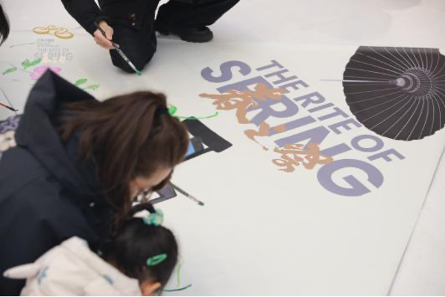 剧院咖啡馆推出《春之祭》联名西点,以巧思设计吸引观众驻足;歌剧厅前厅,伴随”画室之梦“的音乐缓缓流动,观众可在三角画布上自由泼墨,绘制心中的春天;现场还设置了漂流瓶传递活动,观众记录、绘画的观演心情、舞台瞬间将随巡演前往下一站青岛,实现不同城市观众的隔空情感连接。
