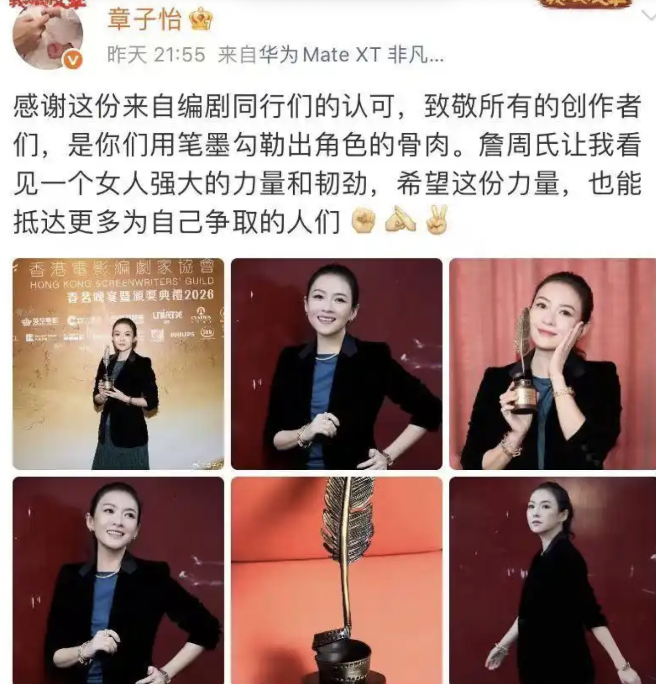 3月10日,章子怡凭借《酱园弄·悬案》中詹周氏一角斩获香港电影编剧家协会“2025年度最佳电影角色奖”。据悉,章子怡还凭借《酱园弄·悬案》提名第44届香港电影金像奖最佳女主角,这是她第五次提名该奖项。