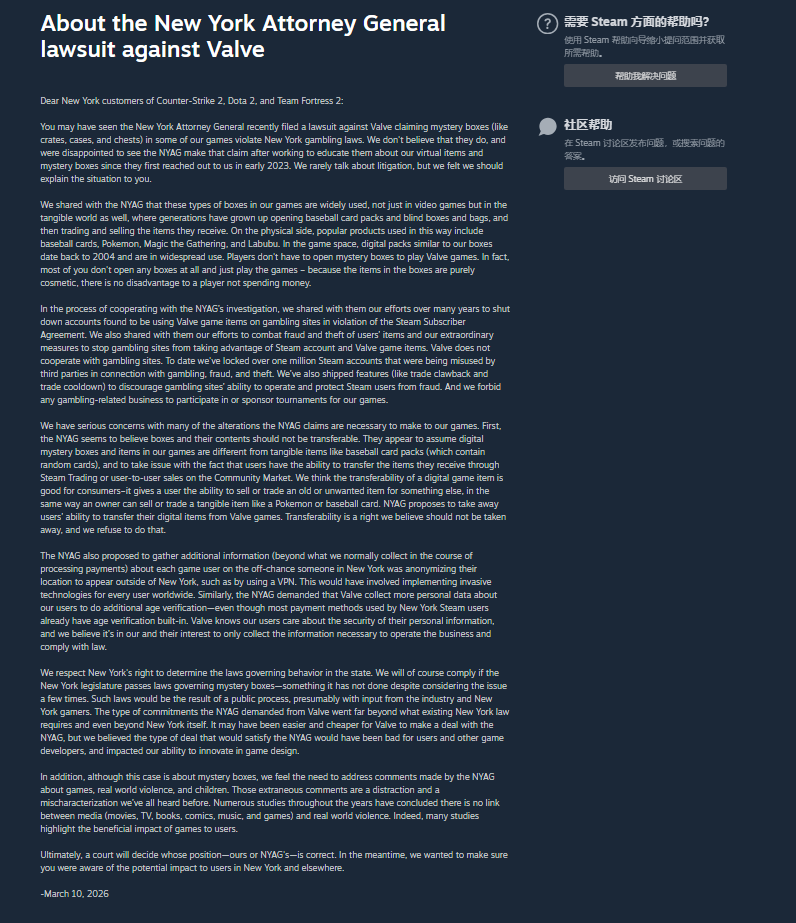 今年2月底,美国知名游戏公司Valve(通称V社)因游戏盲盒宝箱系统涉赌被起诉了,沉默多日后的3月10日,V社发出了正式回应。