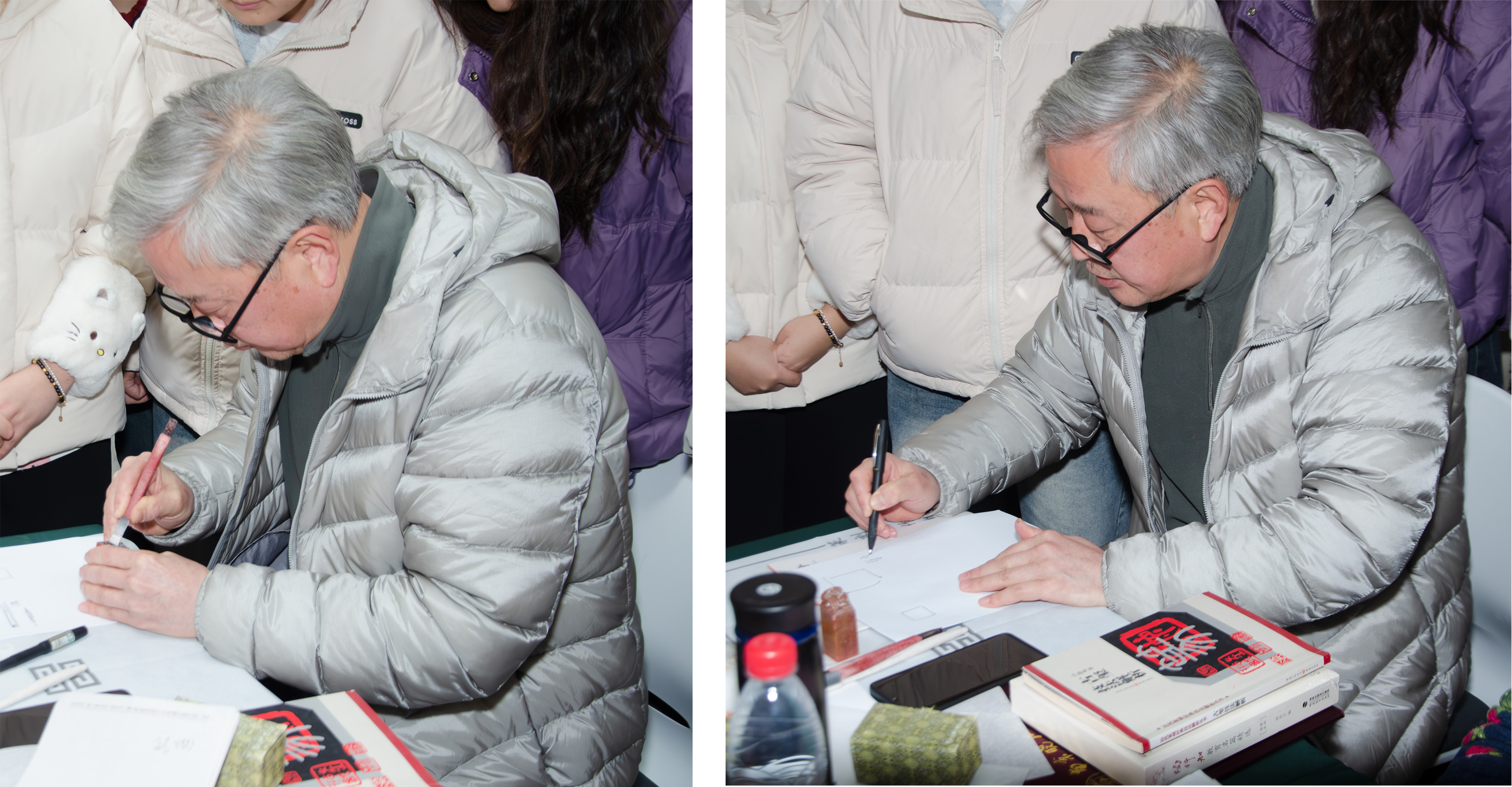 理论讲解后,庞老师现场进行姓名印创作示范,从印稿设计到运刀刻石,每一步都逐一演示,细心讲解。