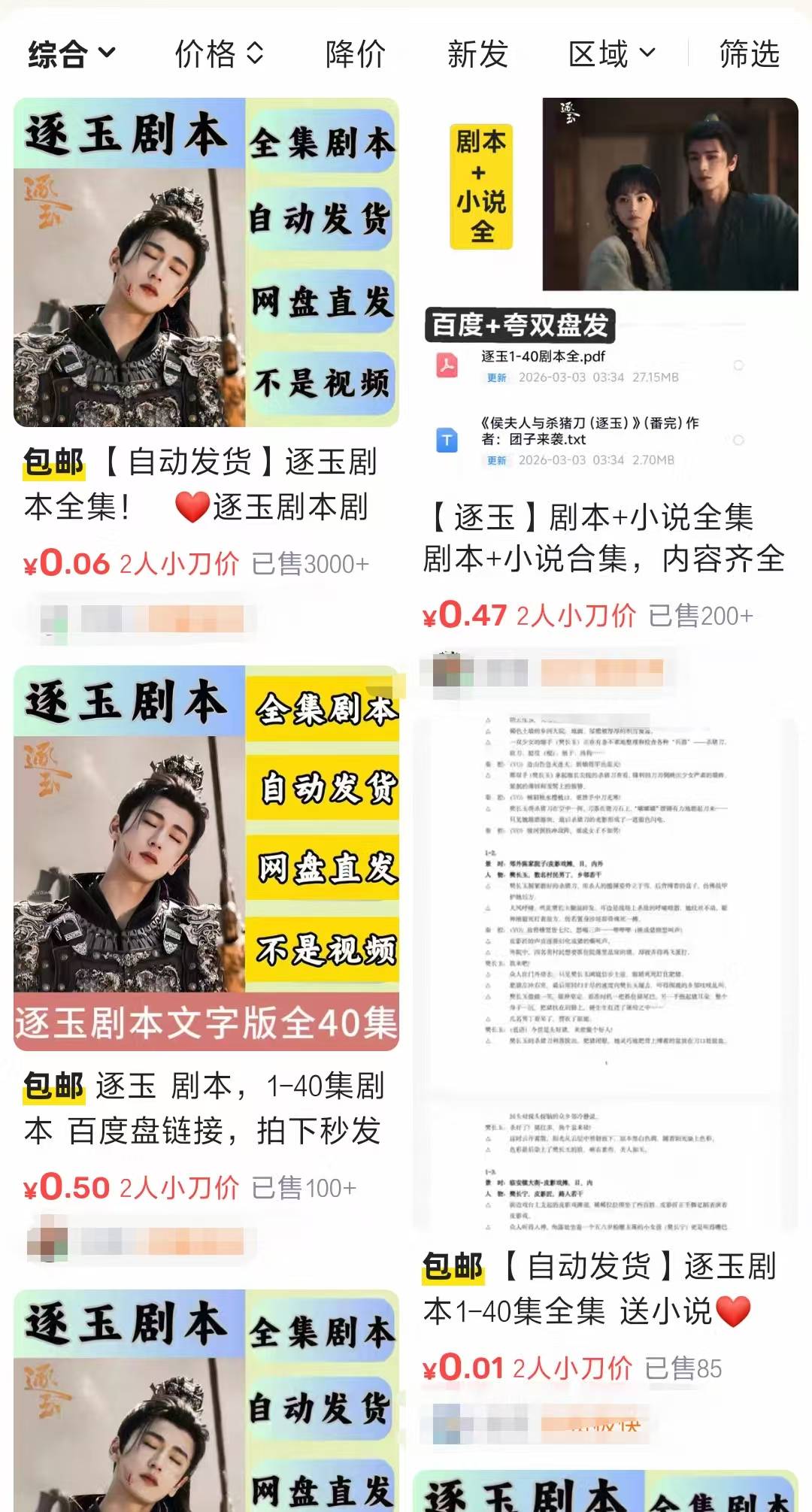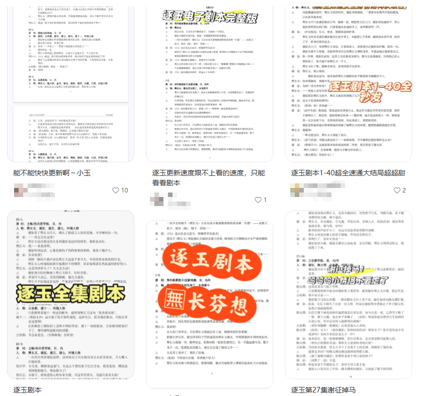 在社交平台上以“逐玉剧本”为关键词搜索,在多平台都能非常容易检索到相关资源,部分博主直接发布网盘链接,网友可以免费获取,部分博主采用引流方式,以“名场面”“超甜瞬间”“大结局”等为噱头宣传,添加该博主账号后会被拉入优惠券群,剧本小说等资源可以在群文件中获取,此类优惠券群的获利模式大体分成佣金模式、拉新奖励、广告合作等,博主通过盗版影视剧资源、盗版小说资源来拉用户进群,资源本身无需付费,博主通过优惠券群获利。还有的剧本PDF是通过交易平台售出的,其中既有个人用户,也有所谓的专营“资源库”的用户。《逐玉》的剧本PDF售价在一两元到几分钱之间,记者花费6分钱购买到了一份《逐玉》PDF剧本,内容除了剧本外还包括的原著小说电子书,剧本显示为1到40集全部内容,看上去像模像样,已播出的部分和剧本大致也对应得上,后续未播出的部分真实性未知。