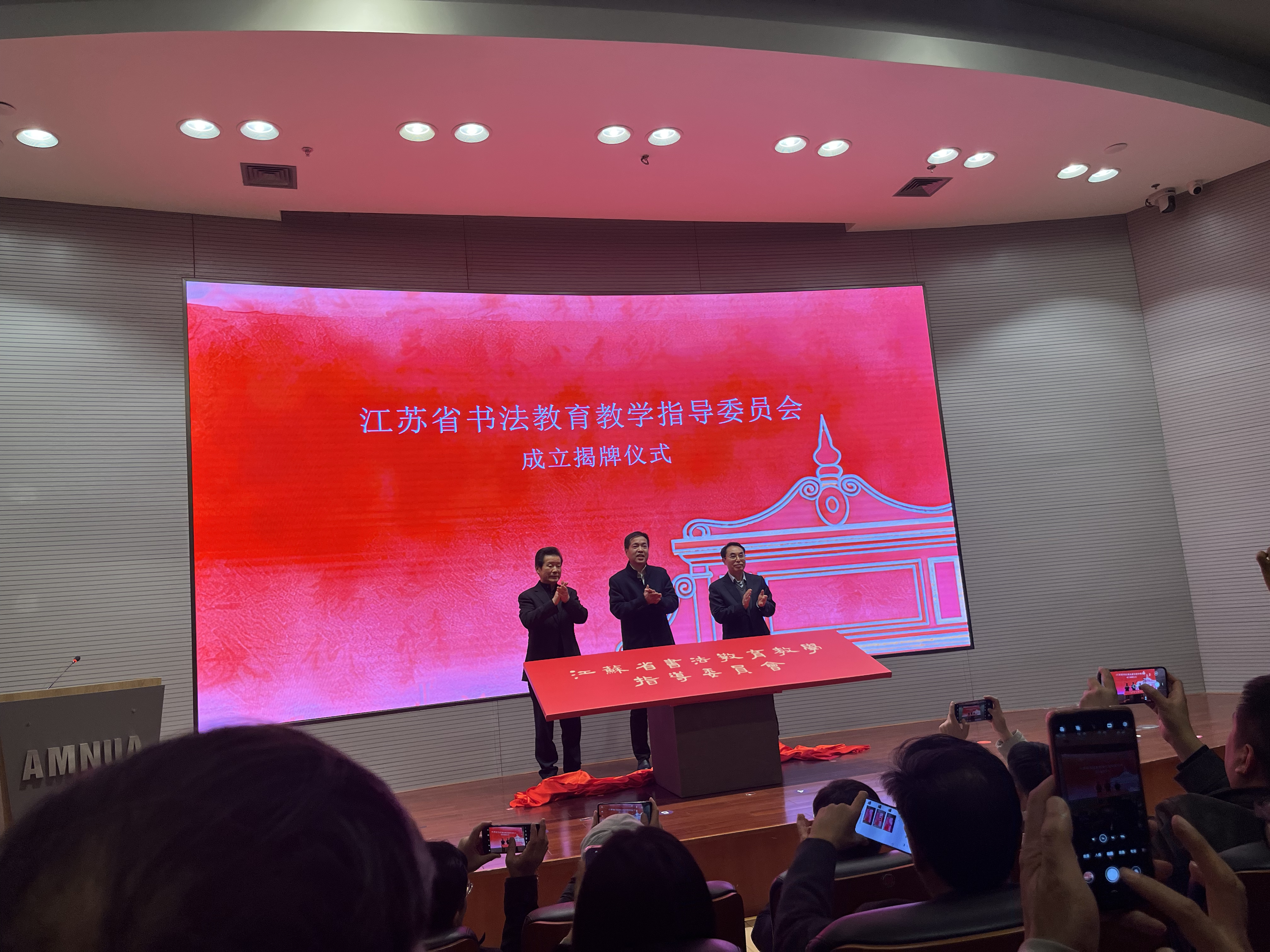 会议的最后一项议程,在全场热烈的掌声中,刘广鸣、言恭达、李金泉共同为“江苏省书法教育教学指导委员会”揭牌——牌匾由年近八旬的言恭达教授连夜挥毫题写,这十四个大字不仅为本次会议增添了厚重与温度,更标志着江苏省书法教育教学工作开启了新的篇章。