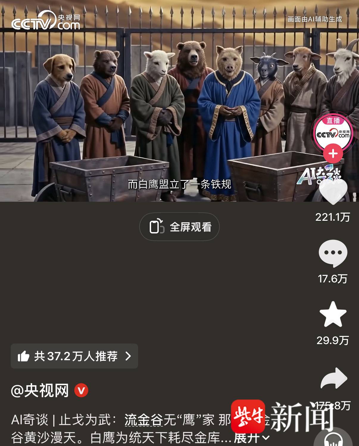 短短的几分钟视频,用AI生成的动物江湖形象来演绎剧情。片中,“流金谷”被设定为“天下咽喉”的兵家必争之地,谷中藏有象征能源命脉的至宝“玄铁髓”,引来各方势力轮番争夺——白鹰盟凭借强悍武力垄断玄铁髓交易,强制推行“白鹰金票”作为唯一结算货币,构建起霸权体系;而波斯寨因坚持保留自身“圣火窟”,拒绝臣服于白鹰盟的垄断,遭到突袭,老寨主战死,更发生“稚子堂”无辜孩童遇害的悲剧,血海深仇就此结下。影片把复杂的国际政治议题,装进了一个通俗易懂的武侠故事里,最后一句“止戈为武,强者自灭”,点出霸权扩张终将反噬自身、和平共处方是长久之道的深意。