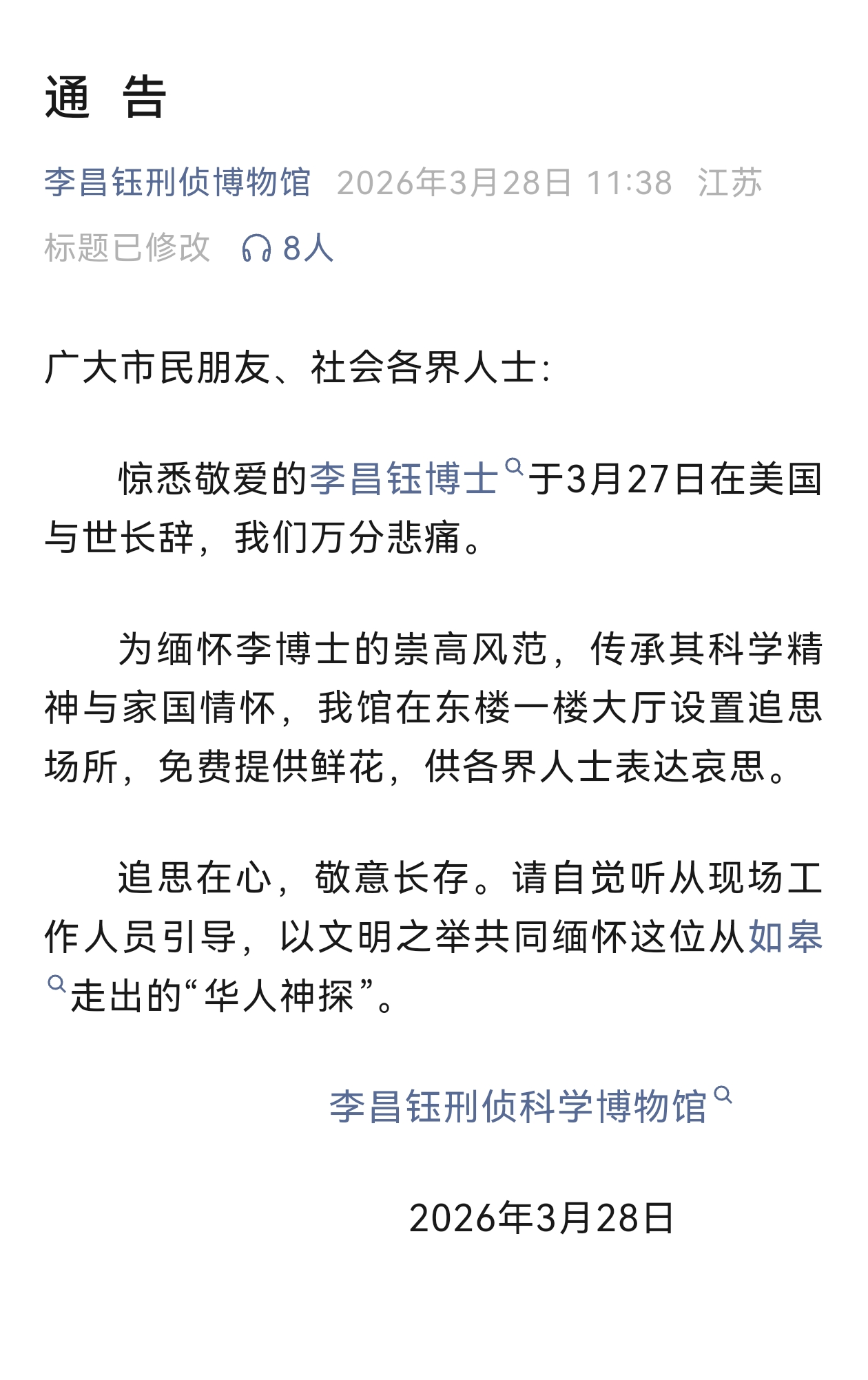 3月28日,位于江苏如皋市的李昌钰刑侦科学博物馆发布公告称:“惊悉敬爱的李昌钰博士于3月27日在美国与世长辞,我们万分悲痛。”