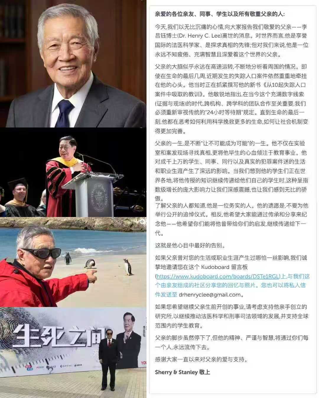 讣告回顾,李昌钰一生践行“让不可能成为可能”,深耕刑事鉴识领域六十余载,参与全球47国超8000起重案要案,从肯尼迪遇刺案、辛普森杀妻案到“9·11”事件法医调查,以微末物证还原真相,被誉为“当代福尔摩斯”。他同时投身教育事业,1975年加入纽黑文大学,1998年创立李昌钰司法鉴定学研究所,执教逾半世纪,桃李遍布全球,其专业学识与治学精神深刻影响一代又一代学生与从业者。