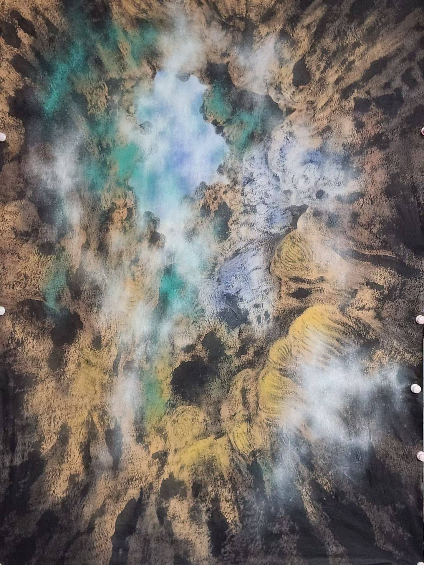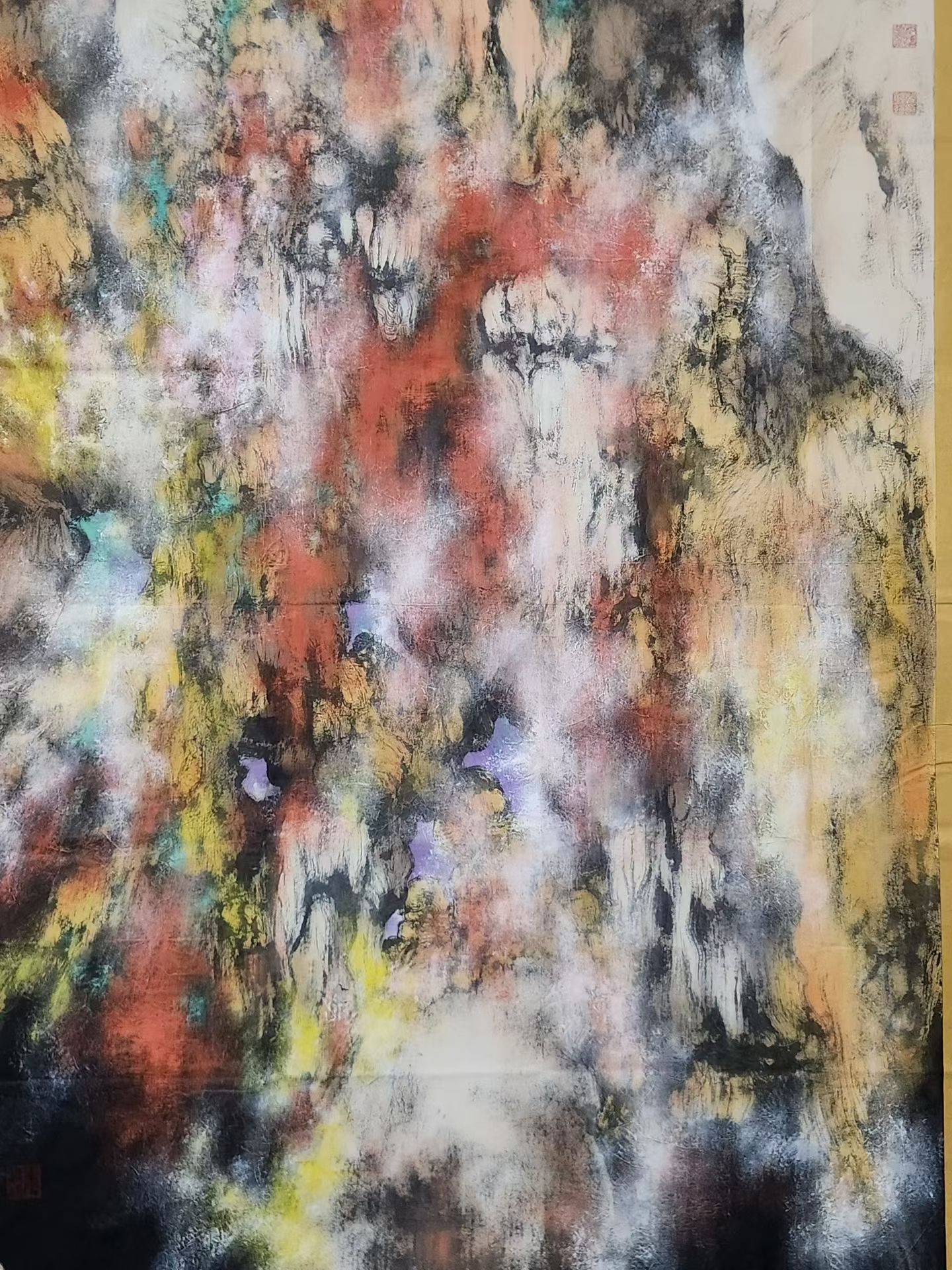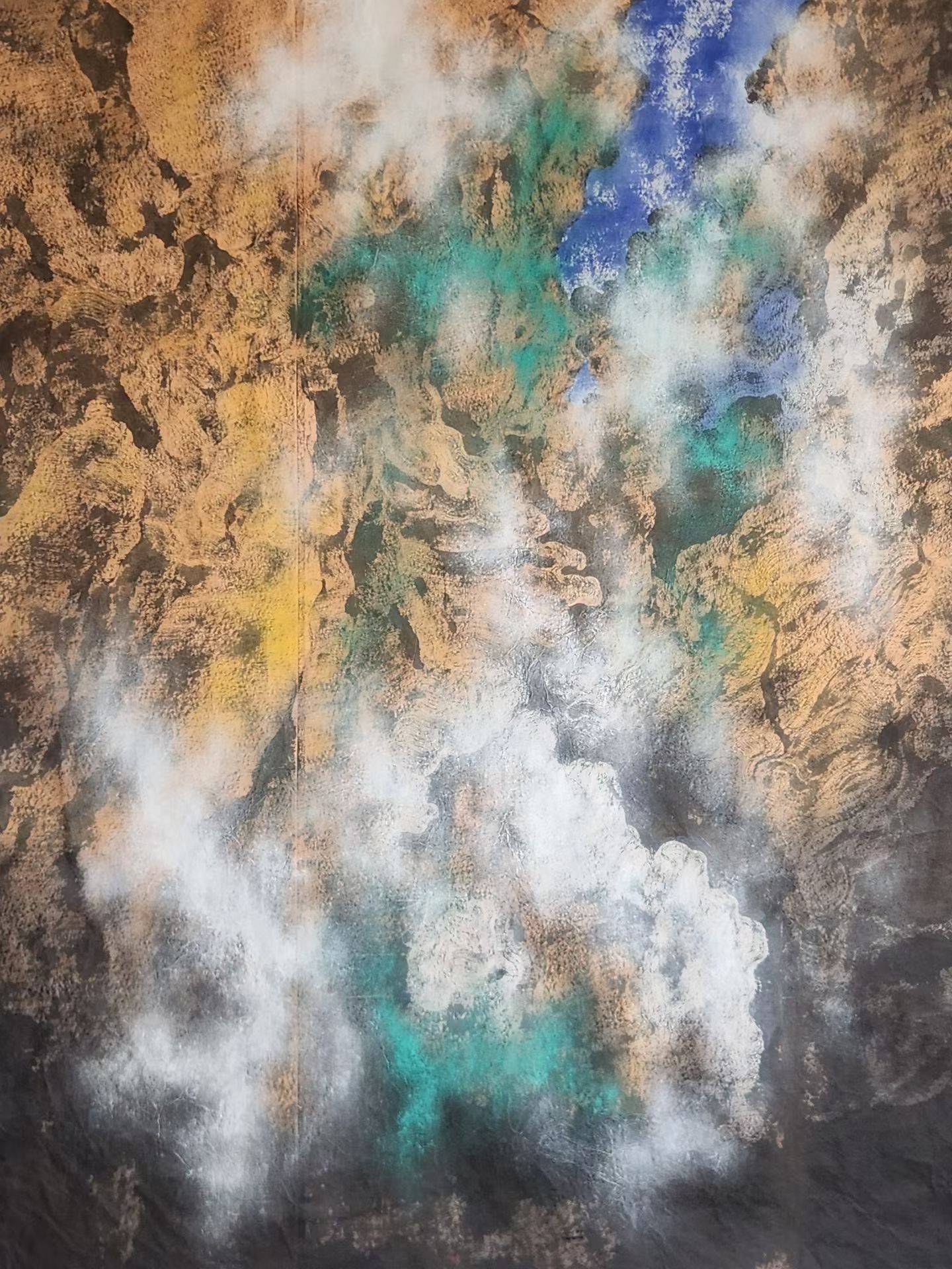 从视觉呈现来看,韩显红的作品首先以强烈的色彩张力打破了传统山水画“以墨为主、以色为辅”的既定格局。在他的笔下,朱砂的炽热、石青的沉郁、藤黄的明丽与墨色的苍润交织碰撞,高纯度的补色并置让画面充满了蓬勃的生命能量。在其山水作品中,赤红与赭石铺陈出山川的雄浑肌理,间或点缀的石青、石紫如宇宙星芒,与氤氲的墨色云雾形成虚实相生的视觉交响;同系列山水作品,则以暖棕与钴蓝的冷暖对冲,勾勒出峡谷的深邃与灵动,白色泼墨如飞瀑流泉,在厚重的肌理中注入轻盈的韵律。这种随心赋彩的用色方式,并非对西方色彩体系的简单移植,而是将传统设色技法与当代视觉经验相融合,让山水在保留东方意韵的同时,拥有了直抵人心的现代审美力量。