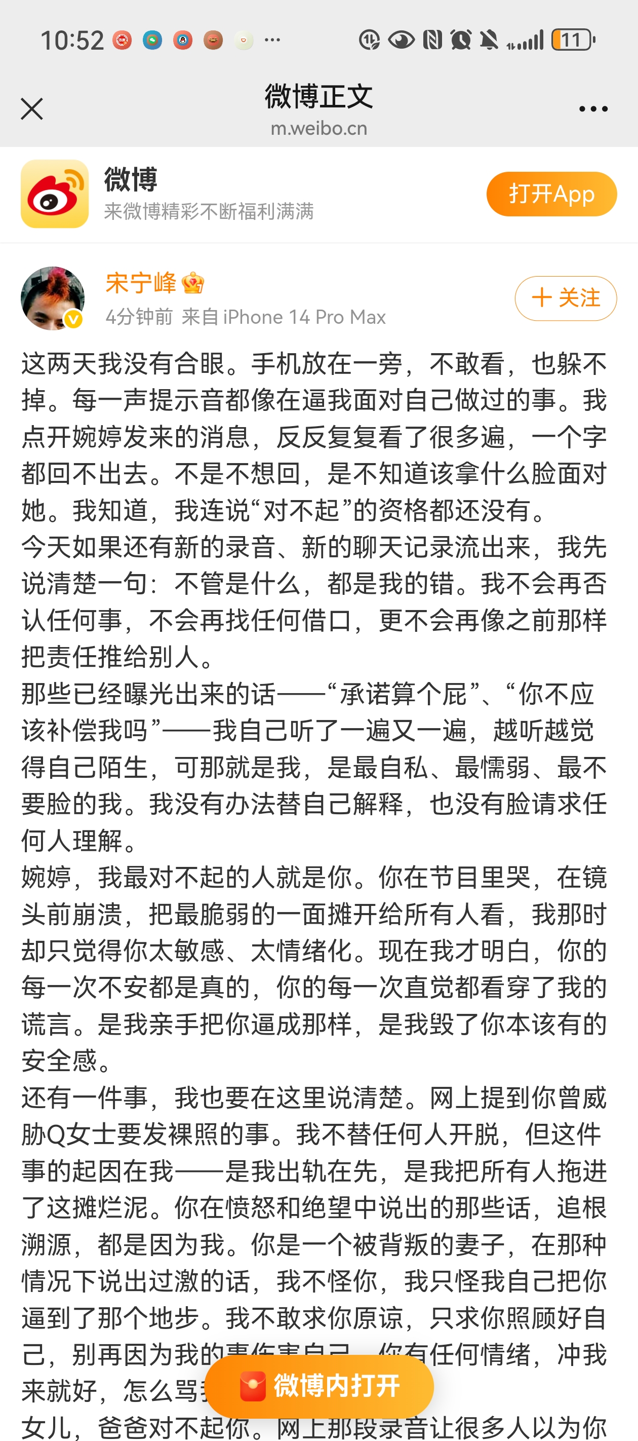 在声明中,宋宁峰首先直言自身连日来的愧疚与煎熬,称“这两天我没有合眼”,面对不断弹出的消息与曝光内容,他坦言无颜面对相关人员,明确表态“不管还有没有新的录音、聊天记录流出,都是我的错”,承诺不再否认事实、寻找借口,更不会将责任推给他人。