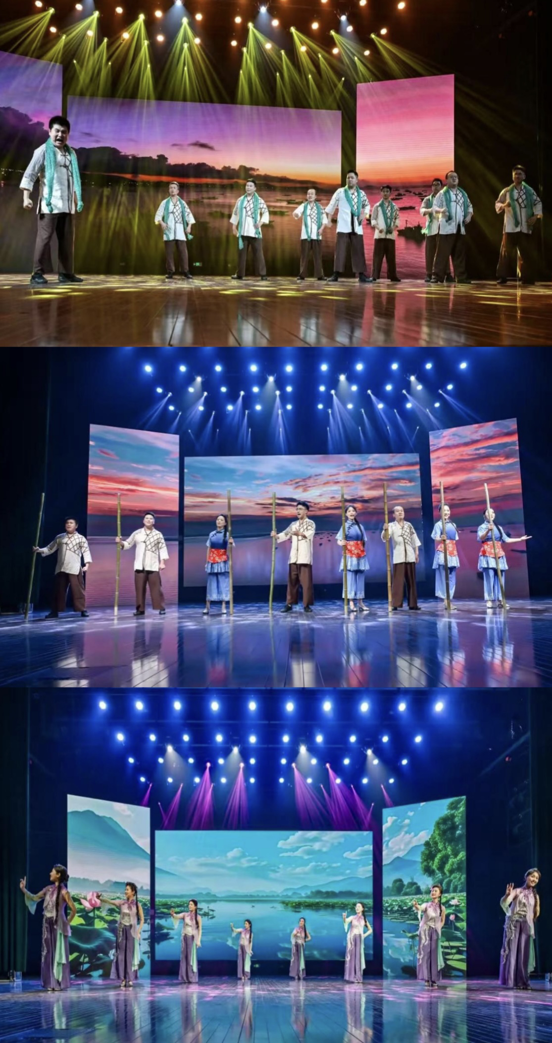 在“乡音溯源·江海根脉”篇章,《战高沙》《海门山歌交关多》《拉网号子》等原生态江海民歌轮番上演,演员们以沉浸式情景演绎还原劳作场景、诉说乡土故事,将如皋、海门、通州等南通各地民歌的原汁原味尽数呈现,质朴旋律与真挚唱腔唤醒乡土记忆,引发观众强烈的乡愁共鸣。“江潮汇韵·区域共生”篇章则立足“以南通民歌为内核,辐射长三角”的创新界定,《江海赋》《声声慢》《潺潺•盐运河》等曲目串联起沿江沿海地区的民歌风采,在旋律交织间彰显江海文化的开放包容,诠释长三角区域文化交流交融、共生共荣的时代内涵。而在“潮起新声·薪火赓续”篇章,《江河云水》《蓝印花》《十八里河口十八里歌》等作品以现代审美赋能传统曲调,将非遗美学、家乡发展、时代精神融入民歌韵律;融入江苏经典民歌《茉莉花》元素的《难忘茉莉花》更是实现主题升华,唱响新时代江海儿女的奋进心声,将现场氛围推向最高潮,赢得阵阵喝彩与经久不息的掌声。