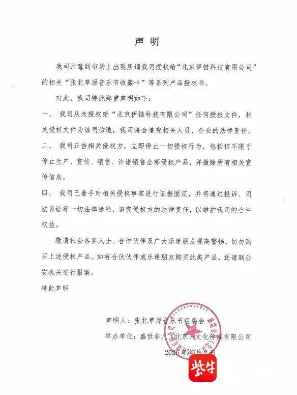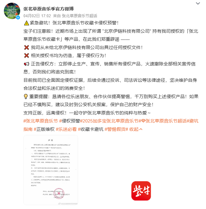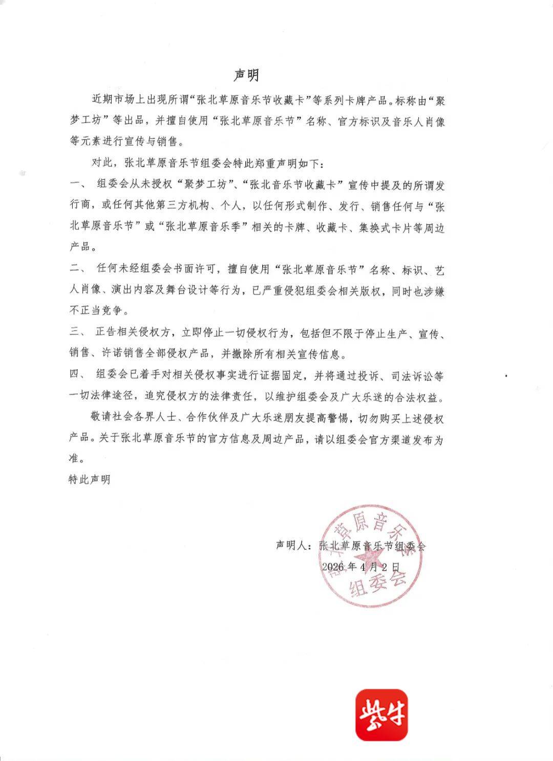 4月2日张北草原音乐节组委会做出回应。组委会发布了一条标题为《关于张北草原音乐节相关侵权收藏产品的郑重警示》的声明,组委会方面表示,组委会从未授权“聚梦工坊”、“张北音乐节收藏卡”宣传中提及的所谓发行商,或任何其他第三方机构、个人,以任何形式制作、发行、销售任何与“张北草原音乐节”或“张北草原音乐季”相关的卡牌、收藏卡、集换式卡片等周边产品。组委会已着手对相关侵权事实进行证据固定,并将通过投诉、司法诉讼等一切法律途径,追究侵权方的法律责任,以维护组委会及广大乐迷的合法权益。