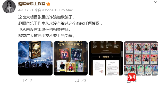 最先做出反应的是音乐人赵照,赵照音乐工作室发文称“这也太明目张胆的诈骗加欺骗了,赵照音乐工作室从来没有给过这个商家任何授权,也从来没有出过任何相关产品,希望广大歌迷朋友不要上当受骗。”赵照工作室的发声印证了这套所谓张北草原音乐节官方授权明星亲签收藏卡是真的有问题的。