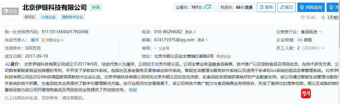 从盛世非凡的声明看来,似乎问题处在了转授权方“北京伊链科技有限公司”。企查查显示,北京伊链科技有限公司主营业务涵盖食品销售、技术推广及宠物食品及用品批发,在技术方面公司拥有智能家居监控装置的专利,是一个食品批发行业公司,这个公司粗看上去似乎和卡牌、音乐演出、艺术设计之类都不相干,那么所谓的音乐节授权又是怎么回事?记者拨打了该企业的公开电话,提示为空号,公司没有官网,社交平台上也没有检索到这家公司的认证公司账号。企查查平台上显示了该公司关联的公众号“居住星球”,微信公众号平台显示这个公众号注册于2018年,在2023年已系统注销停止使用。在地图软件中搜索该企业地址“北京市顺义区赵全营镇红都路8号”,也没有找到这家企业,地图定位找到的是一个名为“东方森泉”的地点,该地点具体信息不明,附近有一些建材公司。