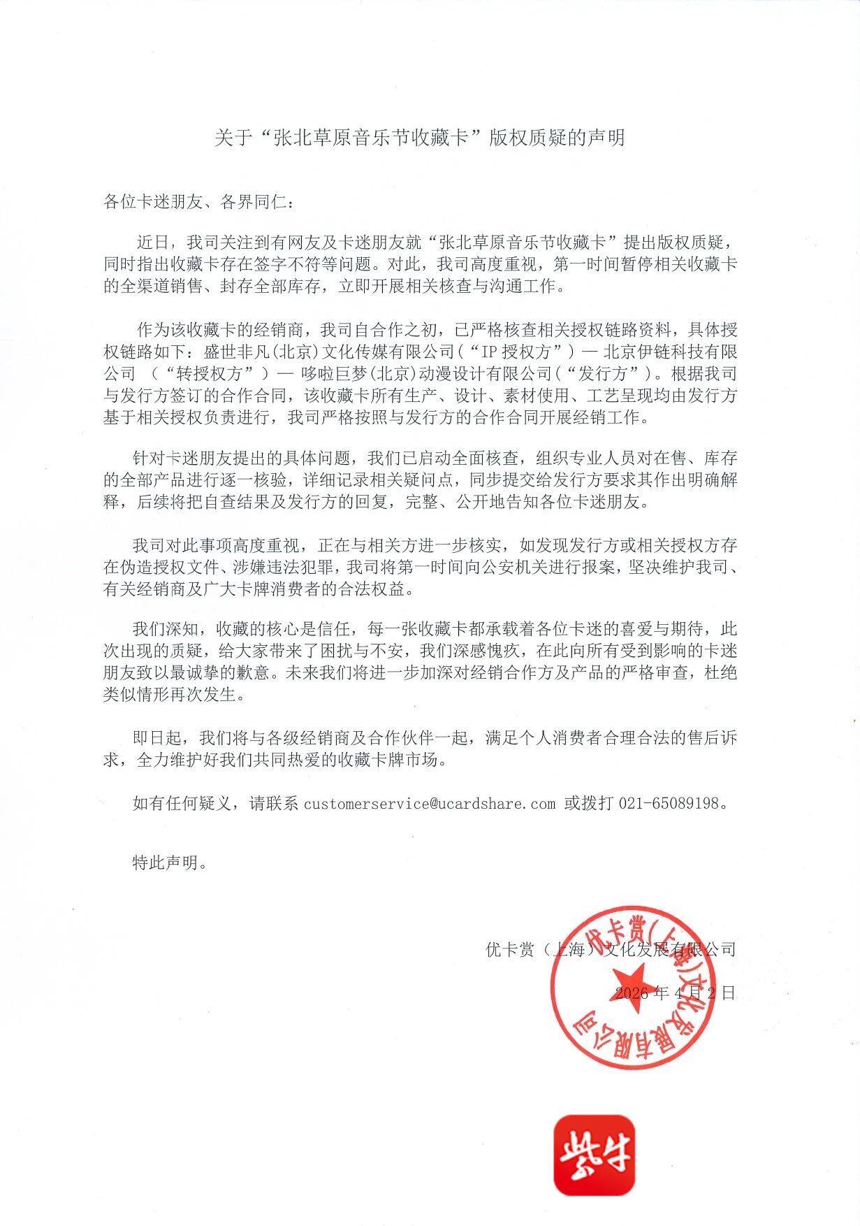 音乐节组委会的官方声明在卡圈炸开了锅,收藏的明星亲签卡如果是假的,那么就毫无收藏价值了,面对版权质疑,此卡的销售方优卡赏在2日回应。优卡赏公开了授权链路,具体而言是“盛世非凡IP授权--北京伊链科技公司转授权--哆啦巨梦设计公司发行---优卡赏经销”。优卡赏针对消费者的问题开始核查,并暂停了此卡的销售。