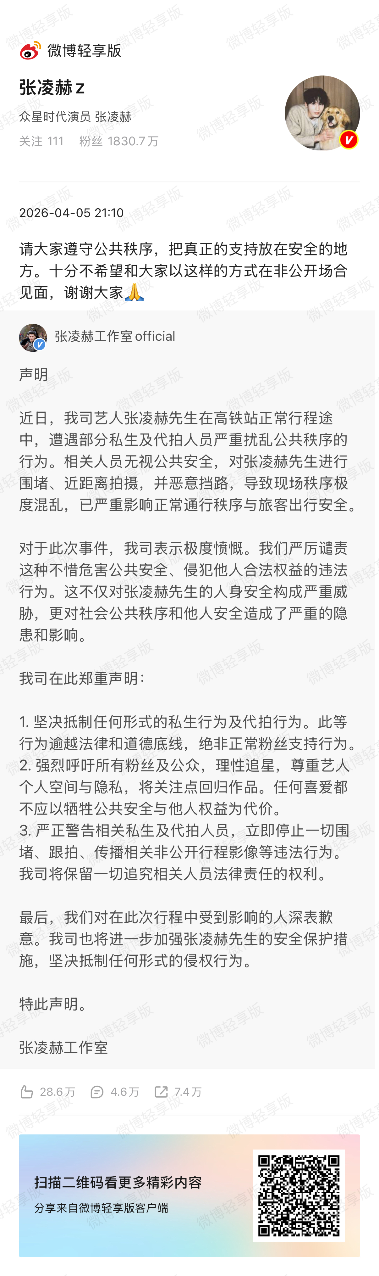 4月5日晚,演员张凌赫在高铁站被私生和代拍围堵的画面,刺痛了很多人。一群人无脑蜂拥,挡路、贴脸拍摄,完全无视公共秩序,其工作室发出“极度愤慨”“严厉谴责”的声明,张凌赫本人也公开喊话:“请大家遵守公共秩序,把真正的支持放在安全的地方。”