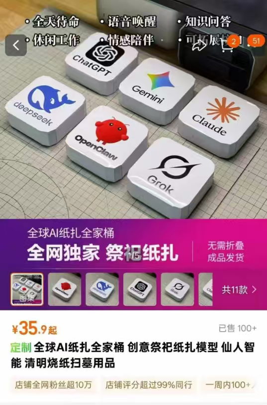 电商商家将deepseek、chatgpt、gemini、openclaw等热门的AI应用工具的图标印刷到了纸扎上,售价不算便宜,一个要35元,全家桶要209元,纸扎的AI算力卡在今年的赛博祭扫中热度也很高,卡面上写着"16GB超大显存""AI全算力加速""地府专属无上限算力",除了AI智能应用外,这几年开始流行起来的具身智能机器人、扫地机器人、ps5游戏机也都有纸扎祭品版,有网友开玩笑说“阴间也是在与时俱进”。