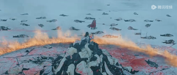 《冰湖重生》的故事也从冰湖之战开始,保持了与《楚乔传》在剧情上的连贯,但在战争细节搭建上却给人留下了不太好的第一印象。《冰湖重生》第一个出圈的槽点就是“尸山”,《楚乔传》对冰湖之战的战争场面设定是符合基本逻辑的,诸葛玥(即宇文玥)被困在冰湖之上寡不敌众,燕洵率众在山崖上俯瞰湖面战况,最后从高处给诸葛玥致命一击。《冰湖重生》在复刻这段情节时就有点迷惑了,或许是为了表现战争的残酷,尸山血海场面骇人,真的就在一片空旷的冰湖上搭出了一座高高的尸体堆成的小山包,而被围困的诸葛玥就站在高高的尸山上,大有生怕敌方看不见自己在哪里的架势,很难理解这个尸山怎么堆起来的,也很难理解为什么诸葛玥非要站在尸山顶上而不是以此为掩体保护自己。