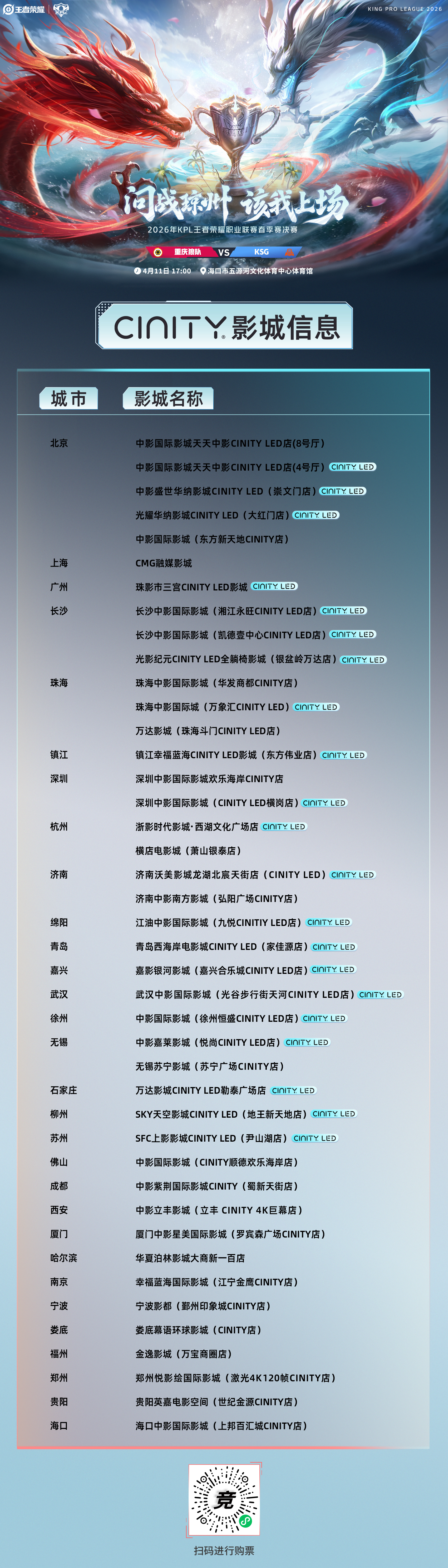 “问战琼州,该我上场!”2026 KPL春季赛决赛即将于4月11日在海口火热开战。恰逢王者荣耀职业联赛(简称:KPL)十周年,为让粉丝沉浸式感受这场由重庆狼队与KSG带来的春日巅峰对决,CINITY特联合预约放映共同打造KPL春季赛决赛官方合作 “痛楼”——北京天天中影汇,并联动30城41座CLED与CINITY影城打造主题狂欢庆典。