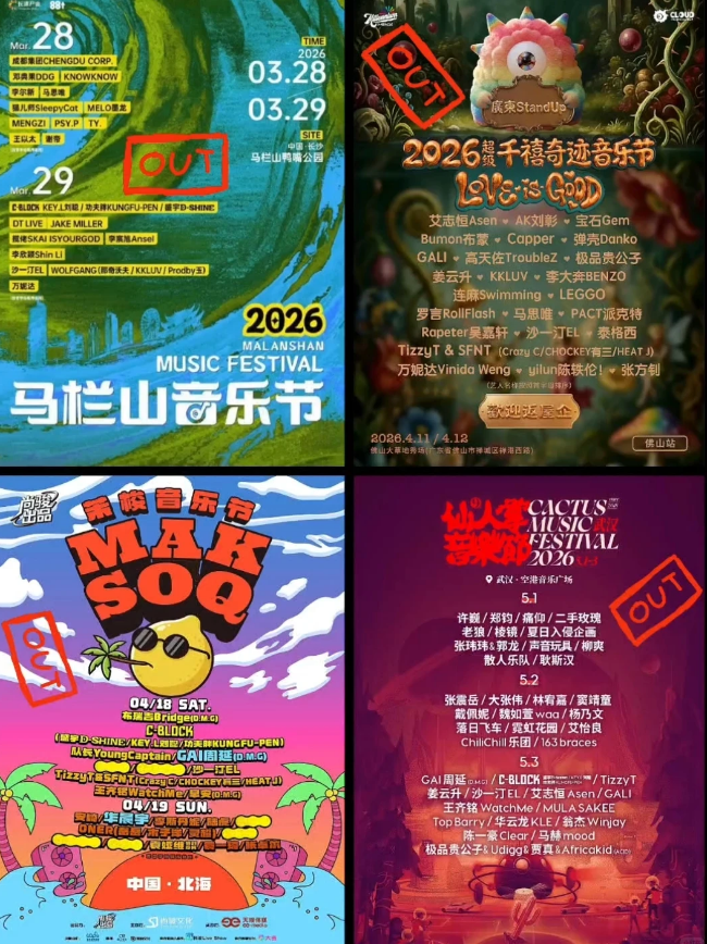 粗略盘点一下,这一两个月时间内“不可抗力”取消的具有一定规模的音乐节数量已差不多有十个。原定3月28日、29日举行的马栏山音乐节取消举办,原阵容包括马思唯、王以太、沙一汀等;原计划3月21日、22日和29日演出的斑马音乐节取消了3月22日场,这一天原定艺人阵容有任嘉伦、毛不易等;原定3月29日演出的DLC梦想日北京站演出取消,原阵容有张星特、曹恩齐等;原定3月28日到29日演出的佛山草莓音乐节取消,原定艺人阵容有陈楚生、杨千嬅、毛不易等;4月6日潍坊风筝音乐节宣布终止举办,原定艺人阵容有魏晨、朱正廷等;原计划4月11日到12日演出的千禧奇迹音乐节也取消了,原定艺人阵容有宝石、派克特等;原定4月11日到12日的桂林奇幻乐园音乐节延期,原阵容包括黄子弘凡、薛凯琪、张韶涵、魏晨等;原4月11日到12日举行的洋葱飞船音乐节取消演出,原阵容包括李宇春、华晨宇、黄子弘凡等;原定4月18日、19日举办的茉梭音乐节宣布取消,原定艺人阵容有华晨宇、GAI周延等;原定5月1日到3日在武汉举行的仙人掌音乐节也取消了,原艺人阵容有许巍、老狼、张震岳、GAI周延等。