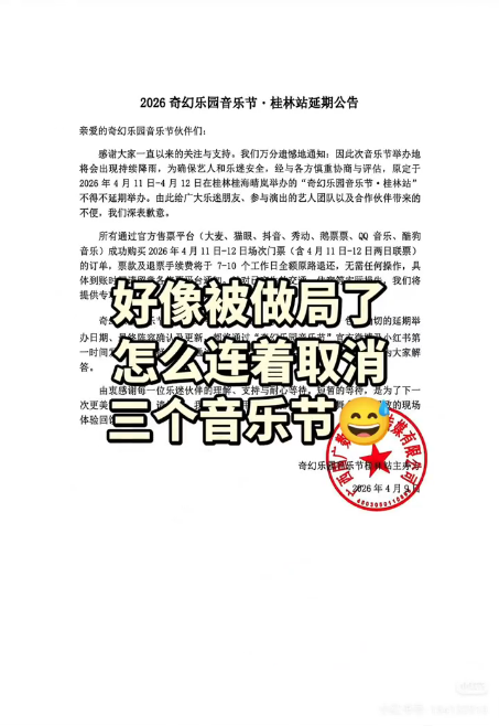 “好像被做局了,怎么连续取消了三个音乐节?”近一个月来,户外音乐节市场震荡不断,接连多个音乐节在开演前几日紧急宣布“不可抗力”取消或者延期演出,难以挽回的机酒损失让不少乐迷怒火中烧。