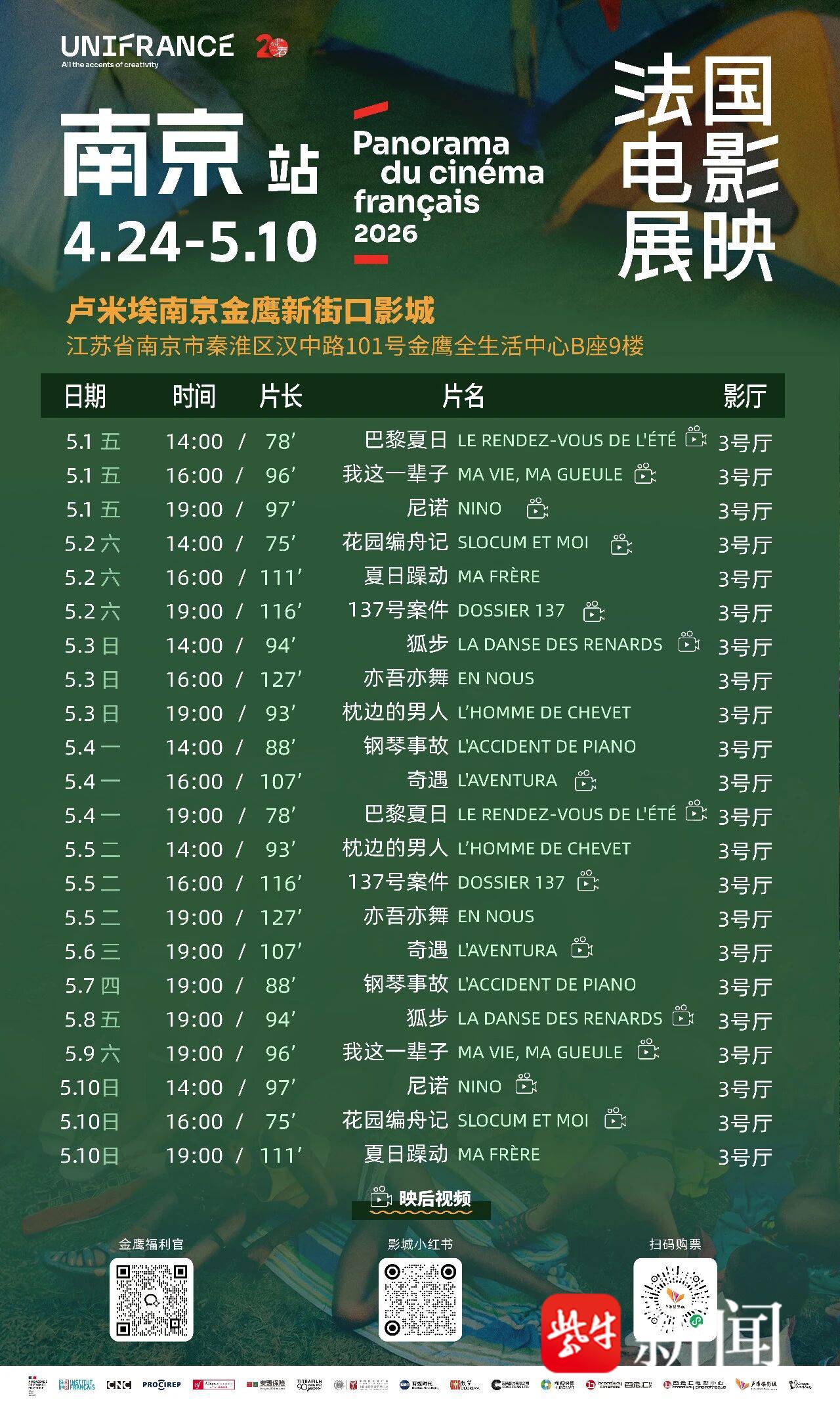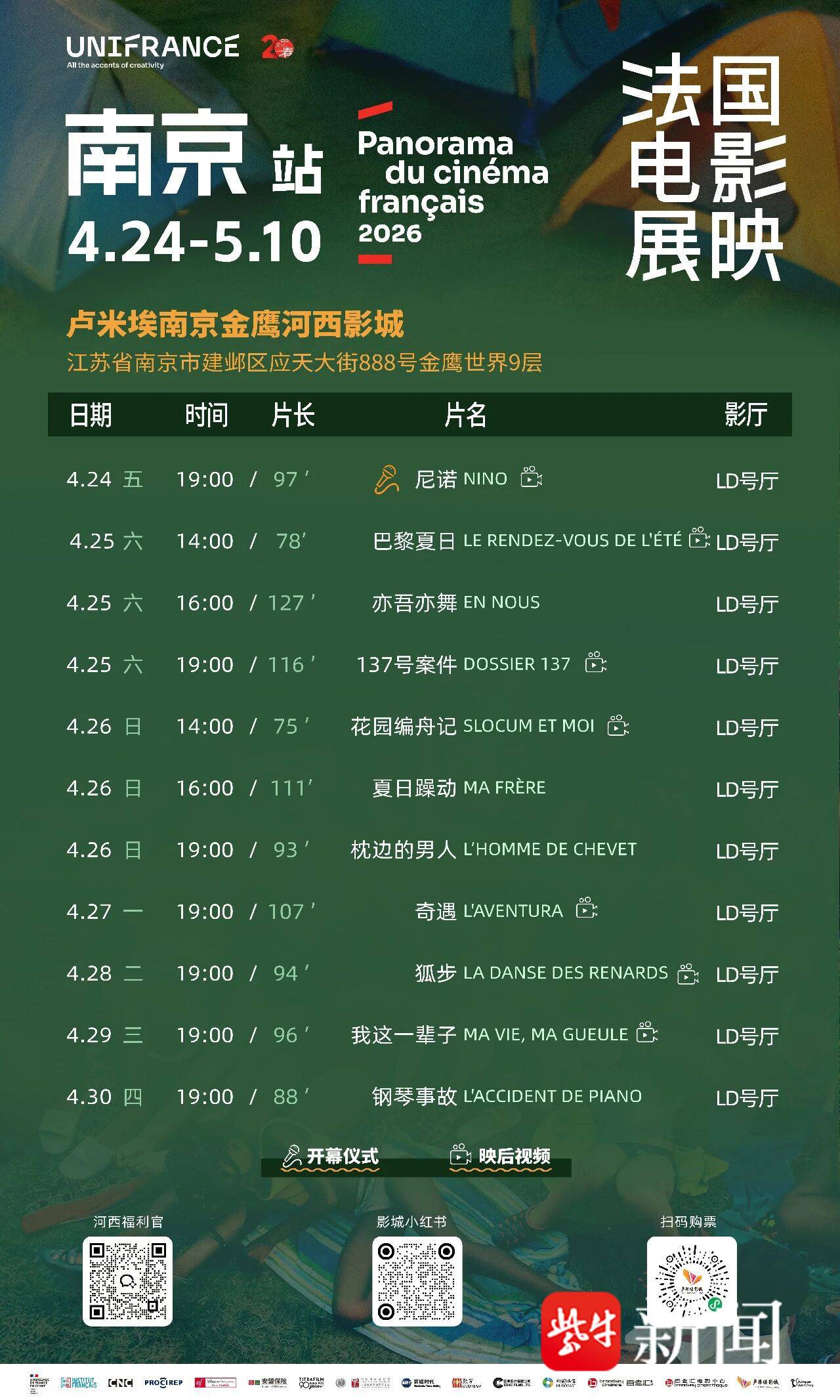2026年法国电影展映·南京站将于4月24日至5月10日,在卢米埃南京金鹰河西影城、卢米埃南京金鹰新街口影城展映。