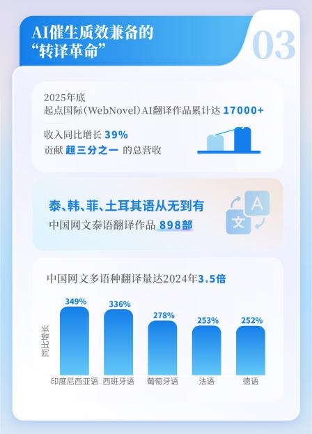 2025年AI工具的发展突飞猛进,相较于时常胡言乱语的机翻,AI工具让翻译变得更加地道,虽说依然难以与专业的翻译者相比较,但文字表达较之机翻也更为精准,中国网文大量的专业术语借助AI网文语料库实现了更为精准的转译,外国读者也能看到原汁原味的东方故事。同时,AI翻译可以以百倍于人工的超高效率在短时间内处理海量文本,并且成本低廉,极大地缩短网文翻译制作的周期和成本。AI工具的普及成为中国网文出海路上开拓小语种市场的重要助力,AI将中文迅速转换成各类小语种,外国读者几乎可以同步追更国内作者更新。