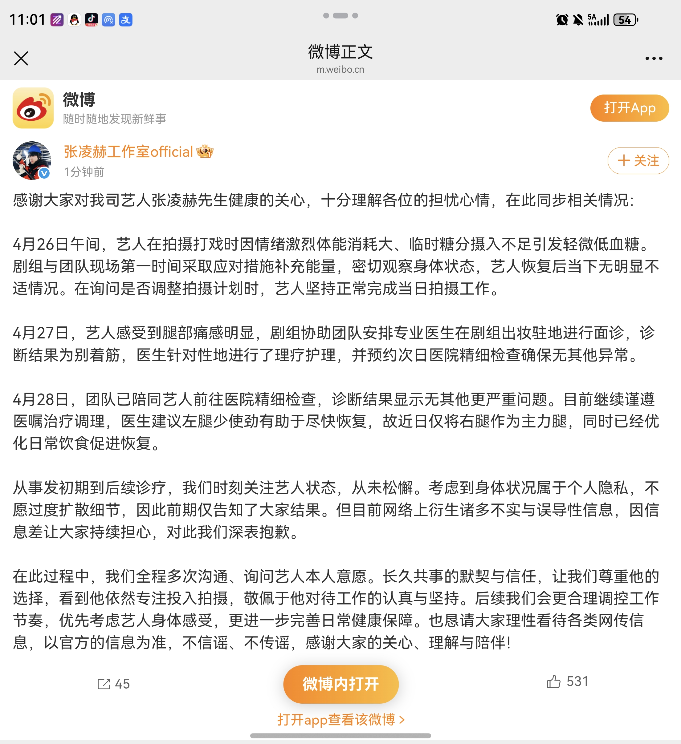 近日,有片场路透曝光称张凌赫坐地尝试起身时,两次用手撑地均无法站起,最终由同组演员林允和工作人员合力搀扶才勉强起身。话题#曝张凌赫低血糖摔倒了#登上热搜。对此,4月28日,张凌赫工作室发文回应,同步相关情况。