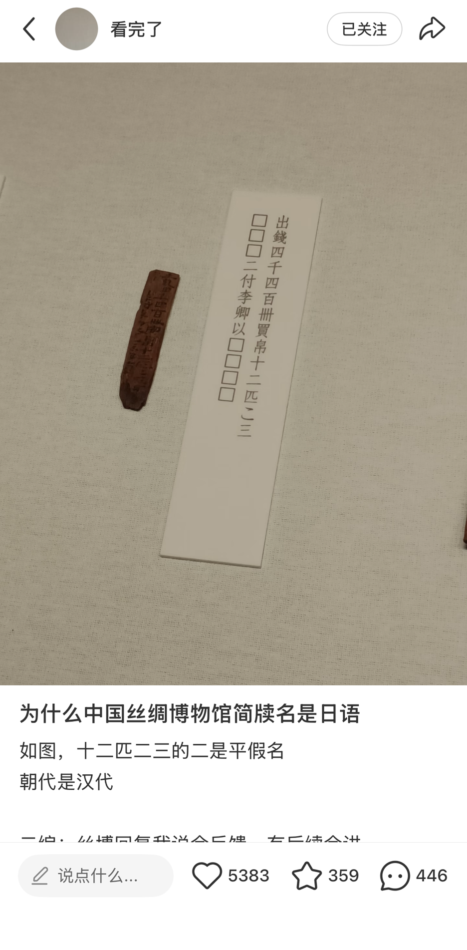 简牍释文竟掺进日文字?日前,游客安女士在小红书上贴出她与朋友参观中国丝绸博物馆时的发现,引发网友热议。截至记者发稿前,该帖已有5200多人点赞,430多条评论。
