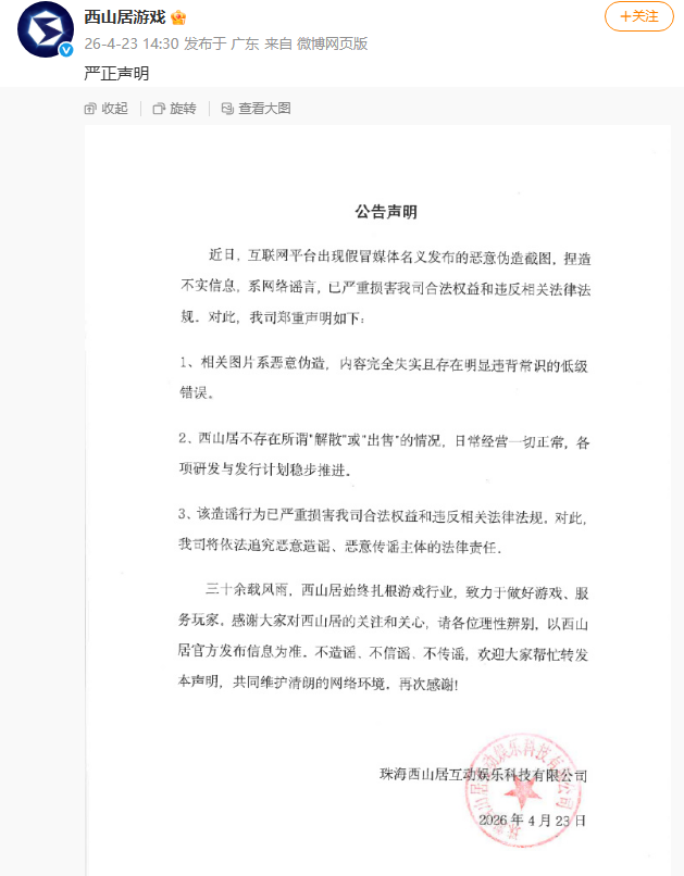 这出“乌龙”并非偶然的网友玩梗,而是当下AI虚假信息泛滥乱象的冰山一角。4月22日,ChatGPT Images 2.0模型正式上线,强大的实景生成能力大幅降低了造假门槛,随之而来的是虚假信息的无序爆发。当天游戏圈就开始疯传一张伪造的财联社报道,内容相当荒诞,称“西山居游戏6月31日倒闭”,因为图片范式与财联社正式发布的新闻图片范式高度一致,一下子骗到了不少玩家,纷纷疑惑运营稳定、口碑良好的西山居为何突然倒闭,直到有人指出“6月31日”这个明显不存在的日期,玩家才惊呼被AI骗了,4月23日,西山居官方发布严正声明,怒斥截图为恶意伪造的虚假内容,并表态将依法追责,这场无端风波得以平息。