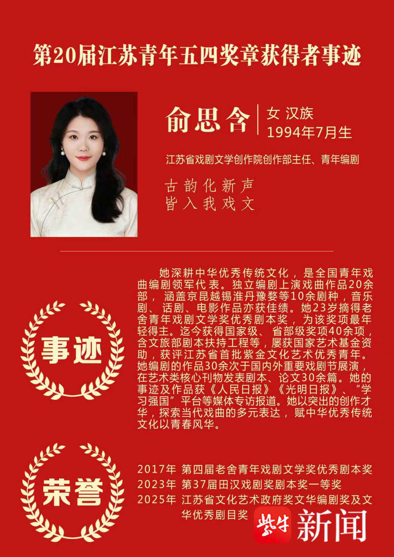 文艺创作领域唯一!青年编剧俞思含荣获第20届江苏青年五四奖章