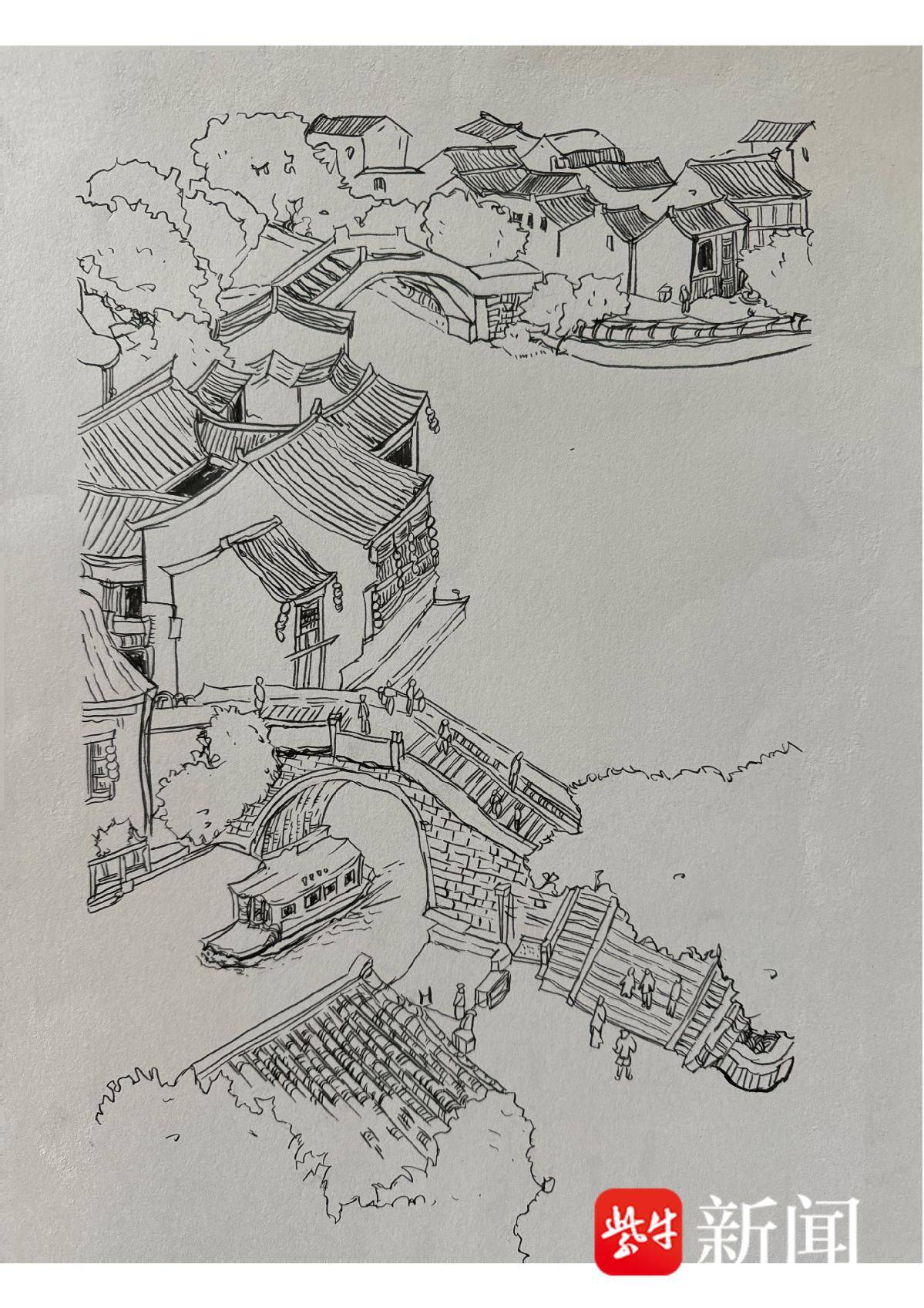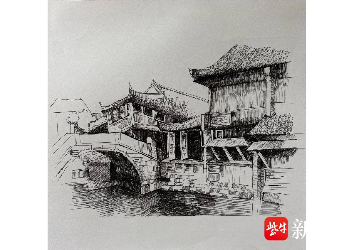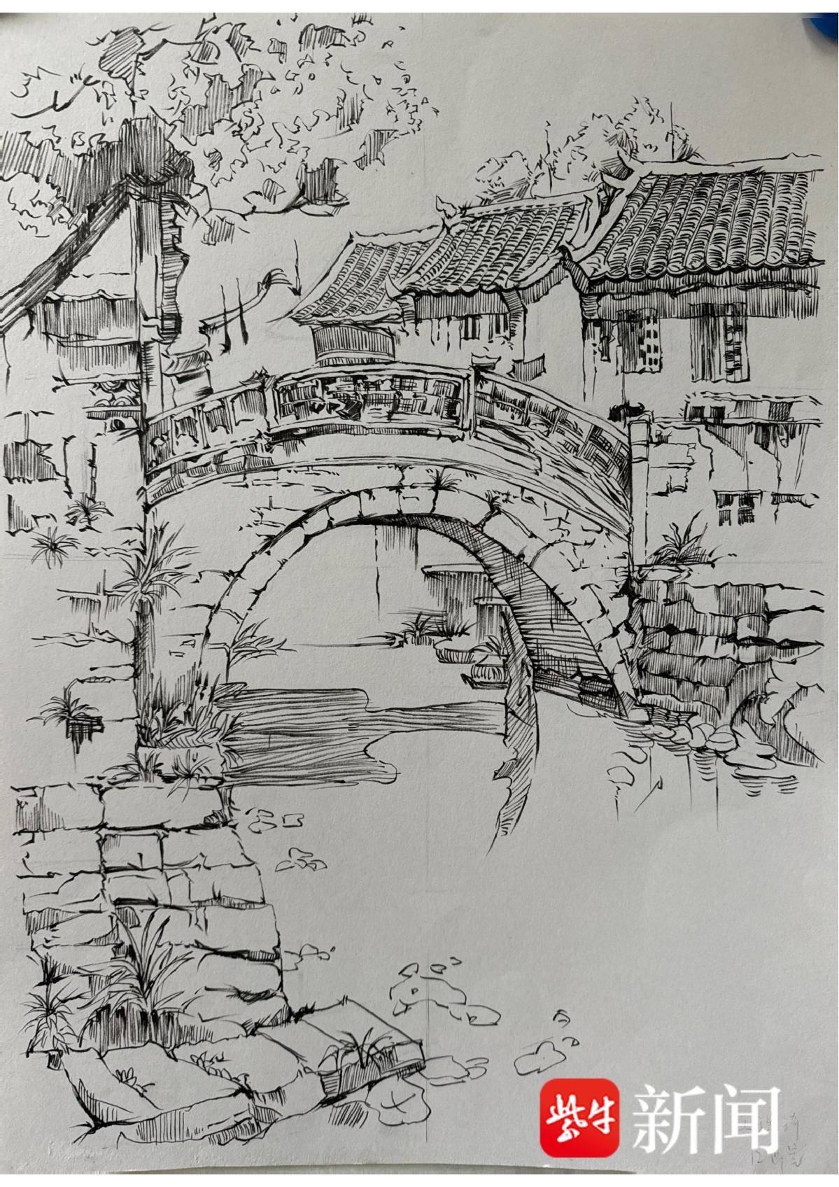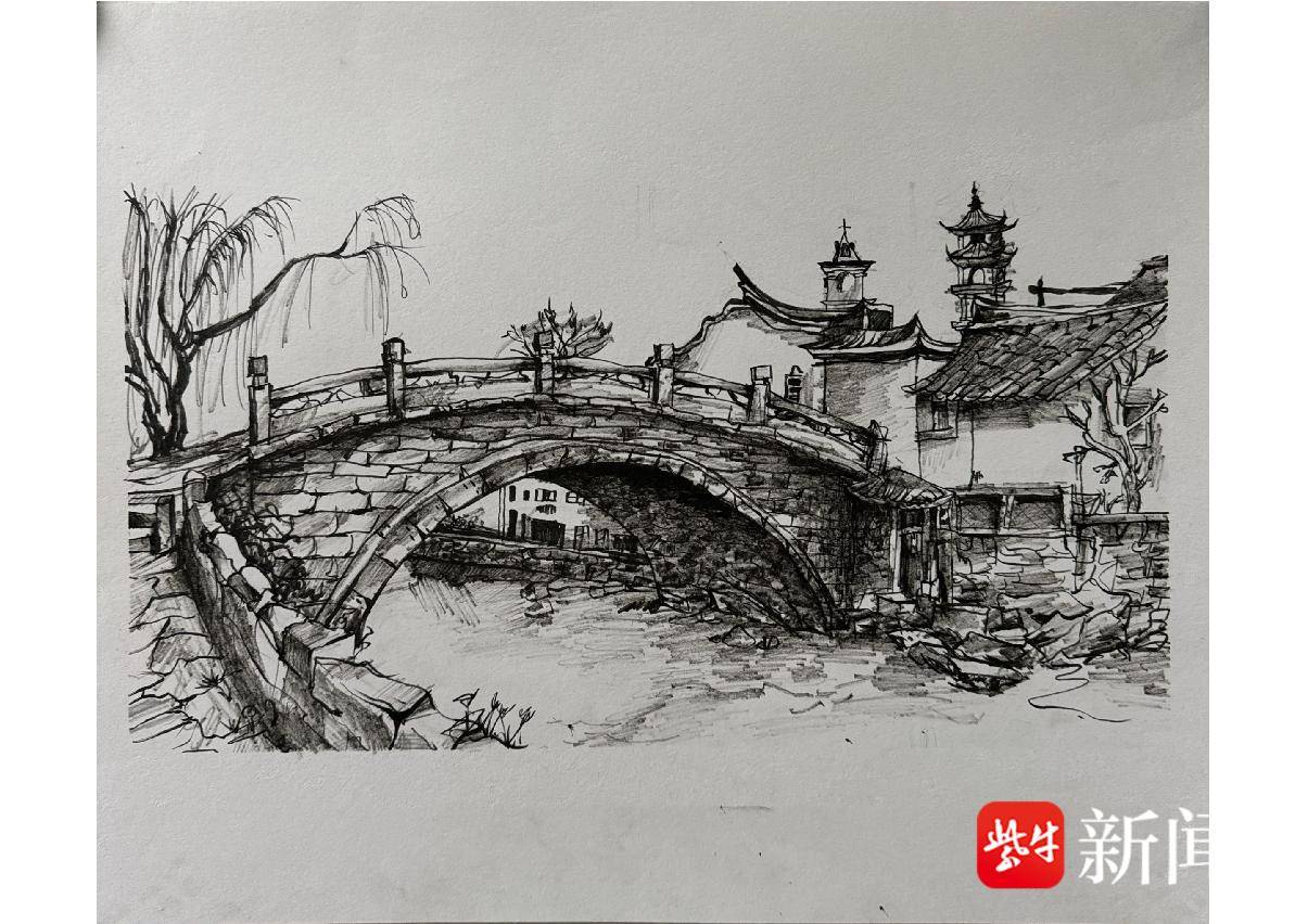 罗伊雯 钢笔画《水乡桥影》