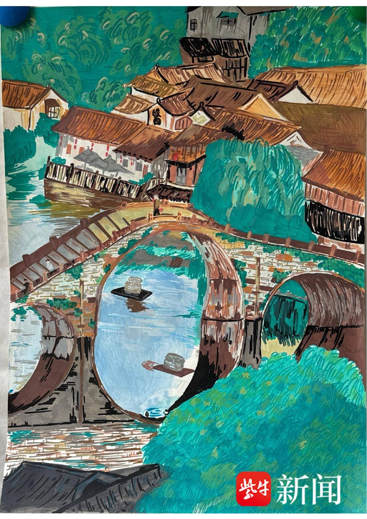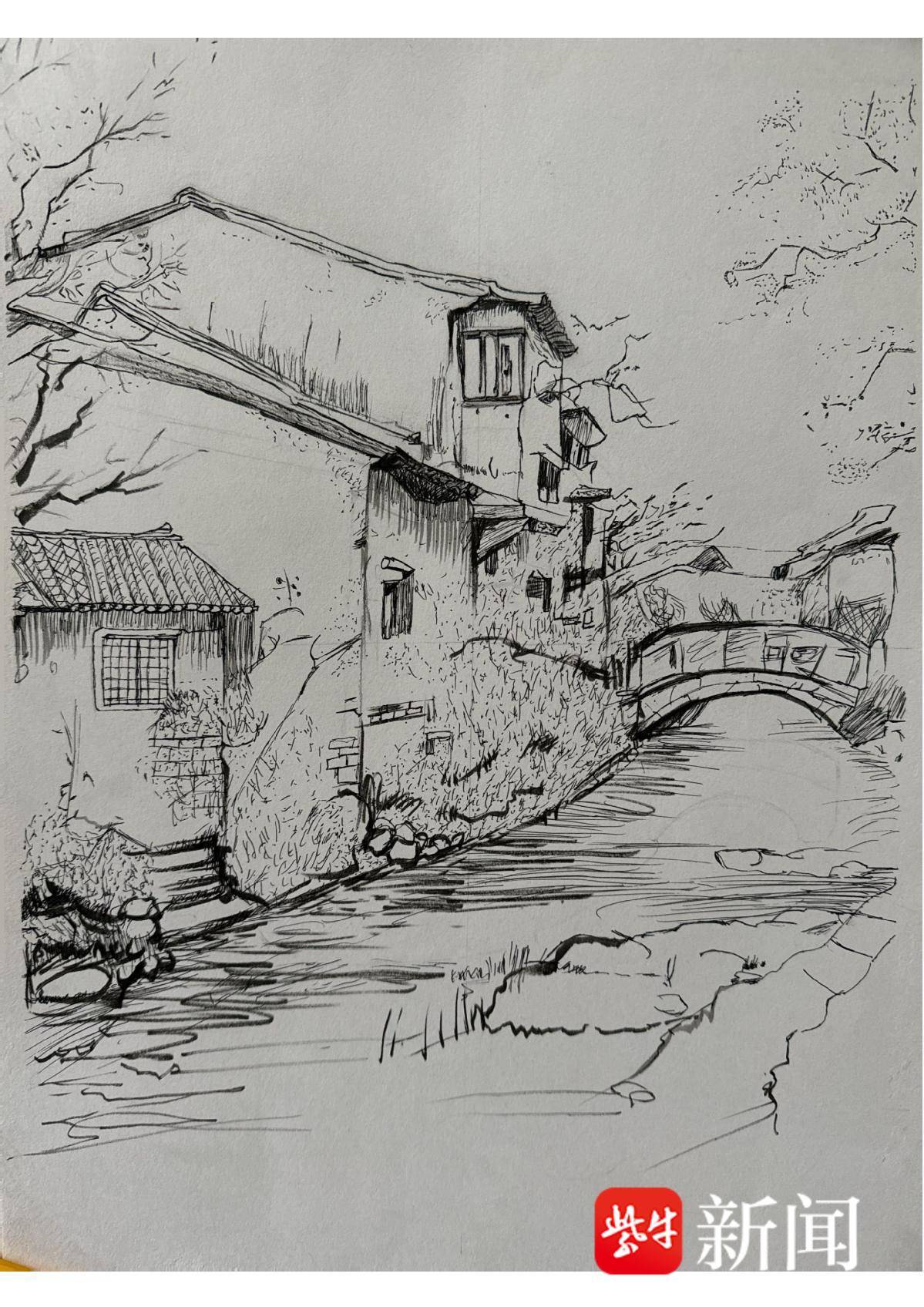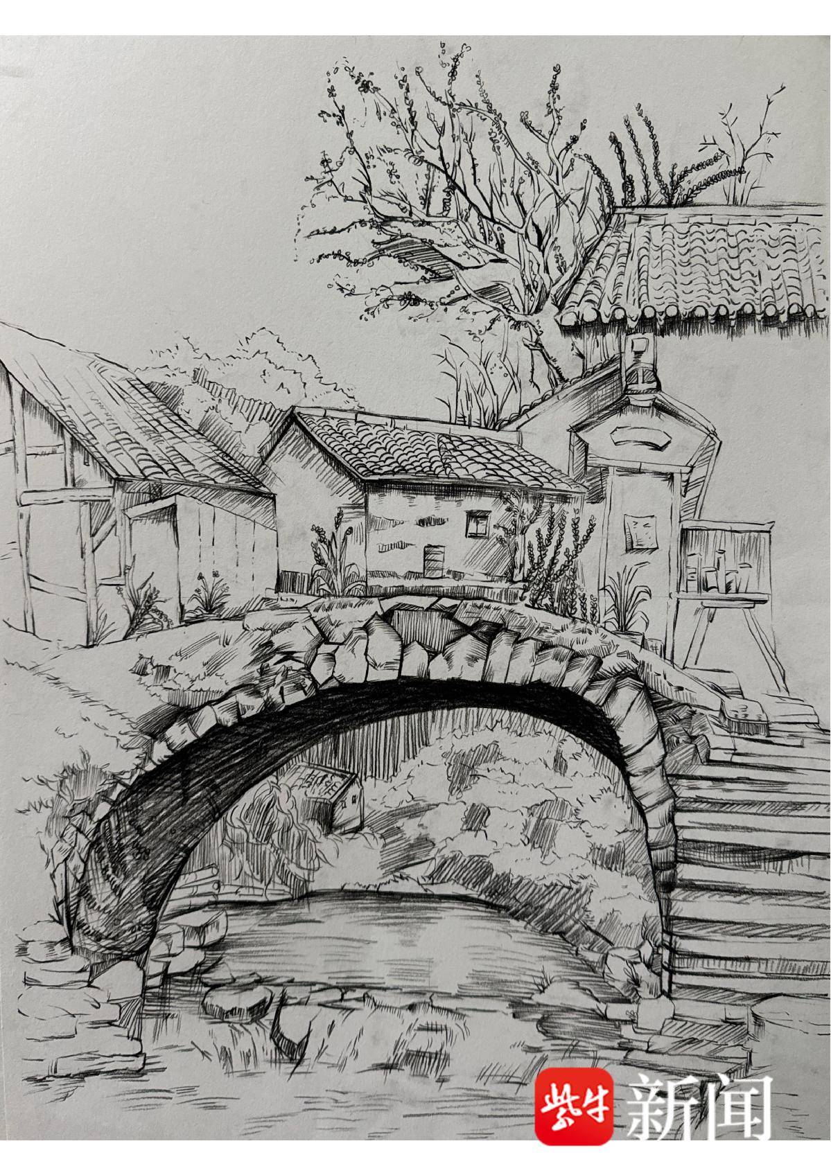罗伊雯 钢笔画《水乡桥影》