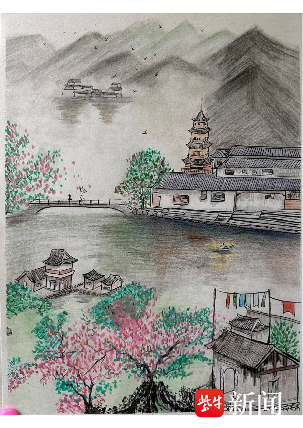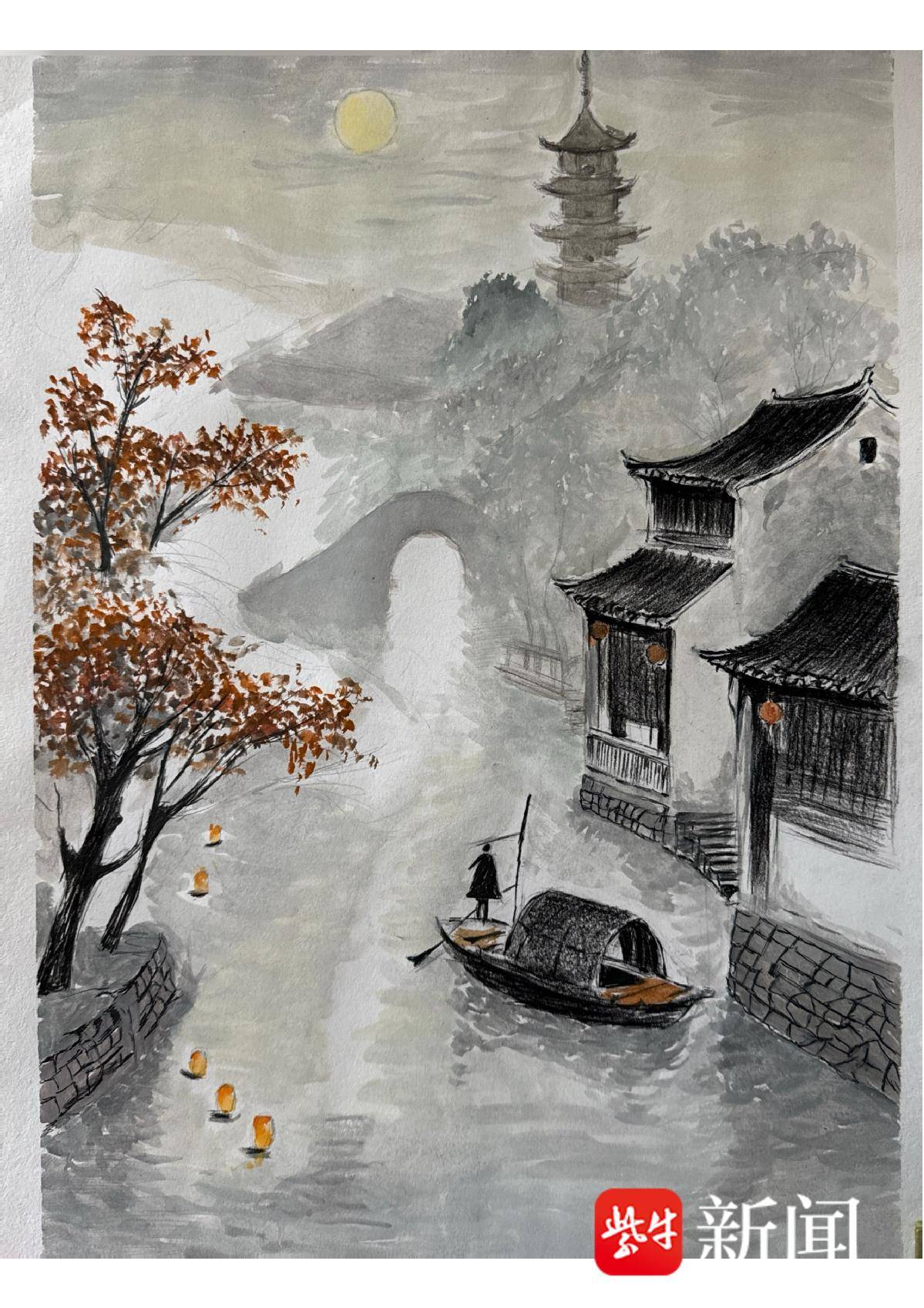 张婉婷 彩铅画《月落平江》