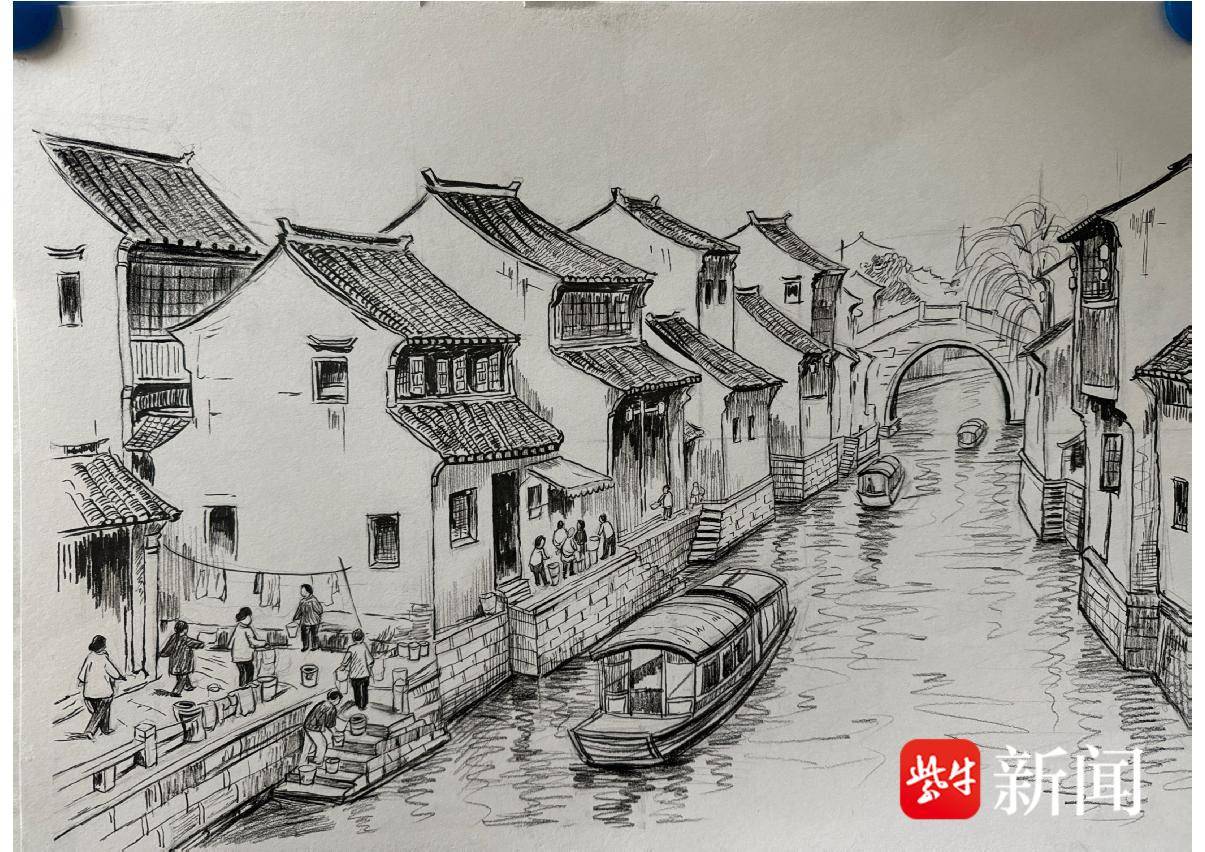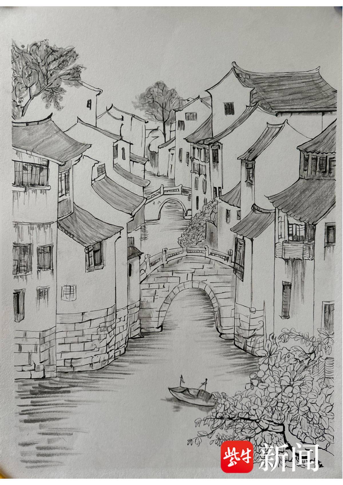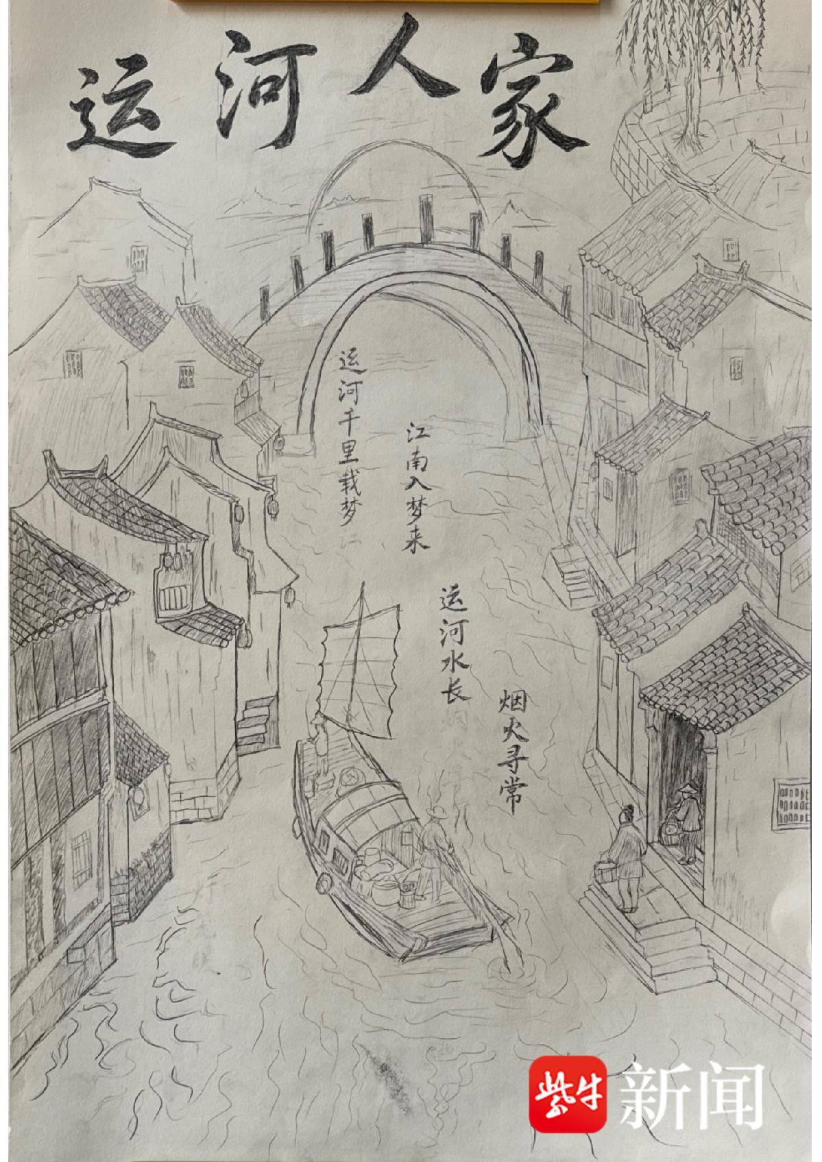 王羿涵 钢笔画《运河市井》