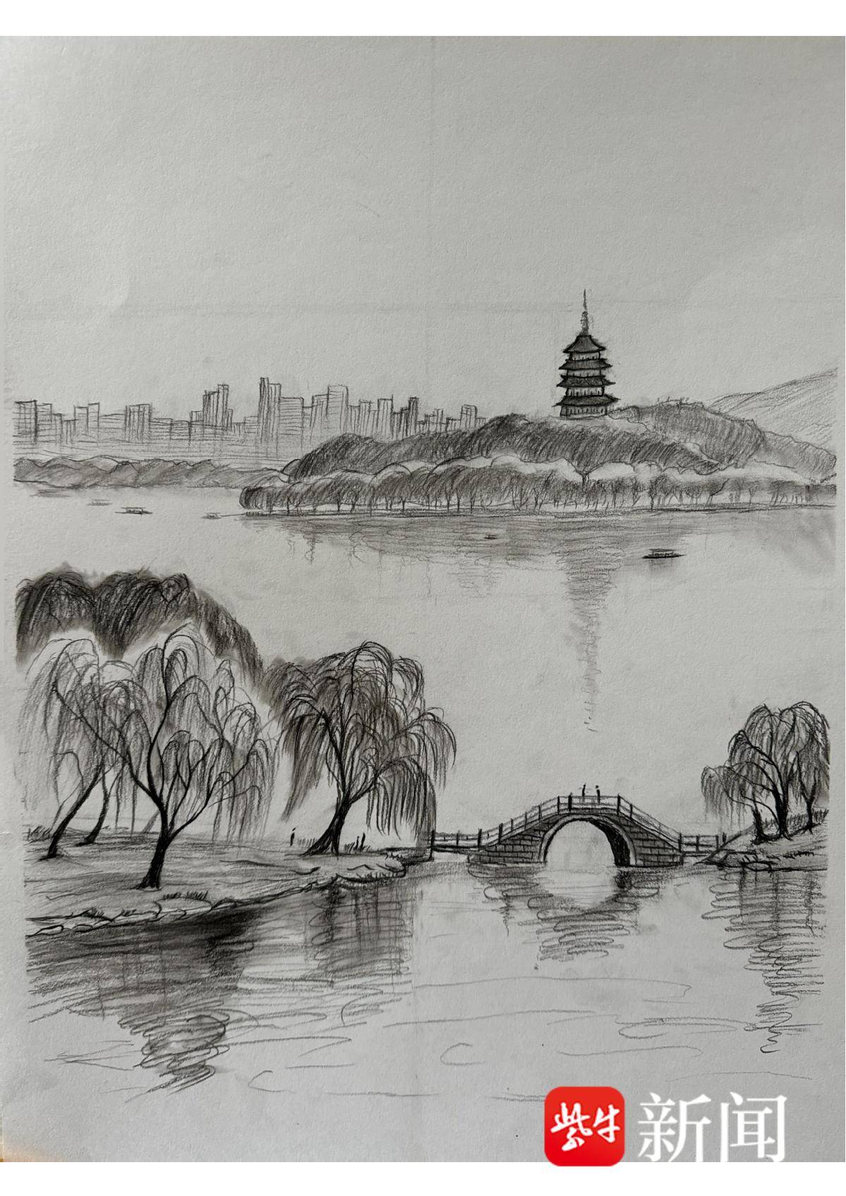 何牧泽 钢笔画《西湖塔影》