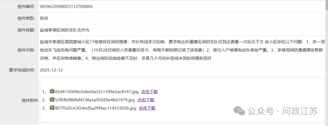 盐城市亭湖区消防救援大队回复,小区负一层电动车飞线充电问题严重,前期物业公司已多次劝阻并整改,但部分业主安全意识不强,导致问题动态反复。大队已约谈物业单位负责人,督促继续加强巡查整改,同时指导属地大洋街道组织网格员加强对居民的宣传教育。单元入户楼道电动车停放严重,该隐患问题属实,大队已责令物业立即改正,并加强检查巡查。现场核查,发现部分楼层存在消防通道放置杂物现象,大队已责令物业立即改正。