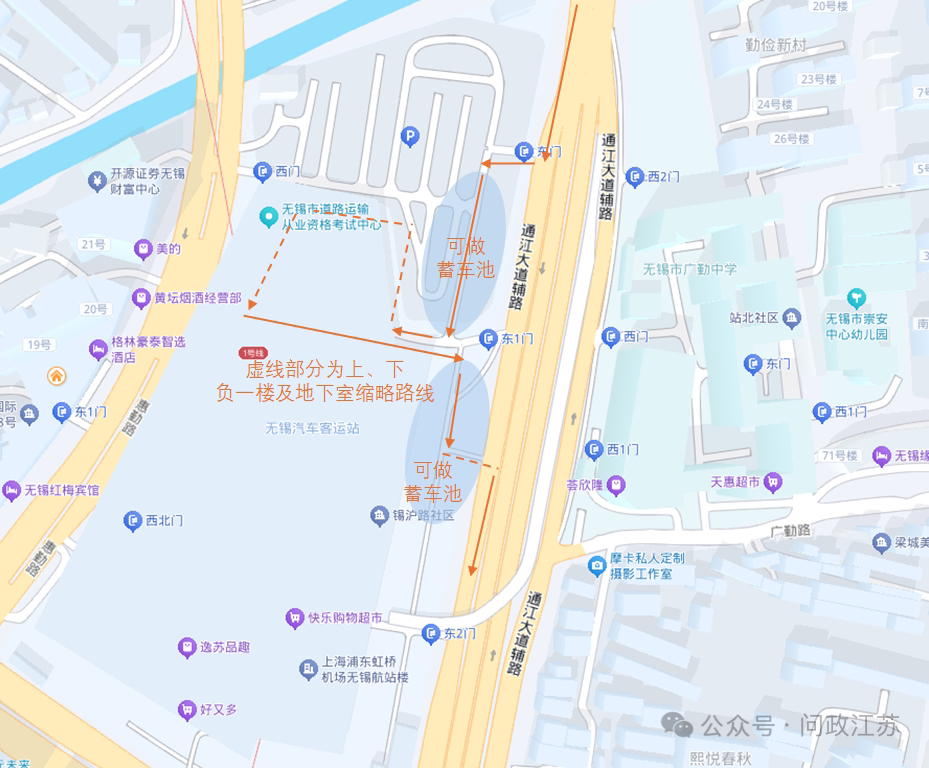 无锡中央车站包含3个汽车站和1个高铁站,新设的网约车接客点与世茂国际广场小区只隔了一条马路。该接客点虽然设有惠勤路、通江大道两个入口,但出口仅设在了惠勤路一侧。由于惠勤路路线更短、通行更便捷,多数网约车司机选择从此处进出,导致该路段车流集中。