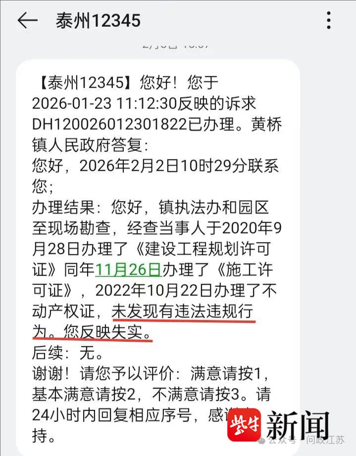 汪先生多次通过12345反映舜亿服装厂项目存在违法分包及违规施工问题。2026年2月2日,黄桥镇人民政府称“未发现项目存在违法违规行为,汪先生反映失实”。同时,黄桥镇不动产登记中心工作人员表示,舜亿服装厂的房产证是“合法合规取得”。