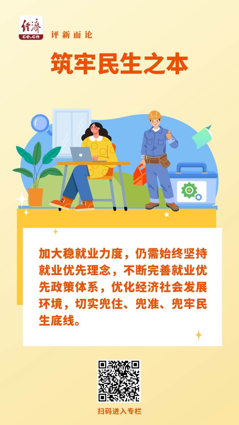 筑牢民生之本,加大稳就业力度。接下来,仍需始终坚持就业优先理念,不断完善就业优先政策体系,优化经济社会发展环境,切实兜住、兜准、兜牢民生底线。当然,要从根本上促进就业扩容提质,需要推动产业升级,加快发展先进制造业集群、壮大新兴产业、布局未来产业,通过提升新产业的就业吸纳能力,来创造更多高质量岗位。不仅如此,更大力度稳定和扩大就业,还意味着今后要更加重视“投资于人”,加强人才队伍质量建设。因为这不仅关乎当下,也是为未来储备发展力量。