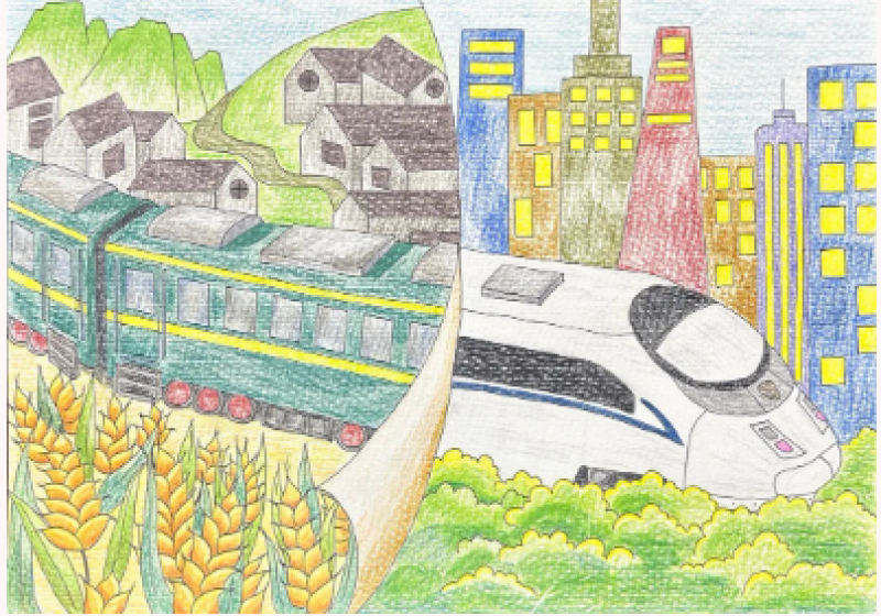 铁路的那一端,是我爸爸妈妈小时候生活的地方,是我亲爱的爷爷奶奶、外公外婆的家。每到假期,我和爸爸妈妈就会坐火车回趟老家。一路上,我坐在车窗边,看着窗外的风景慢慢变化:高楼变成了田野,马路变成了小河,还有一块块绿油油的稻田在风中轻轻摇摆,就像在向我们打招呼。我问妈妈:“你小时候是不是走过这条路?”妈妈点点头,眼睛里有笑意也有回忆。我想,那一定是个温暖和阳光的童年。