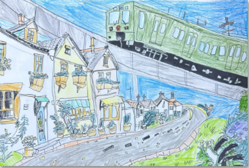 铁路的这端,是我现在生活的家。我在这里上学、写作业、和小伙伴玩耍。每天早上,我吃完早饭,就能听到“呜——”的火车鸣笛,好像在对我说:“早上好啊,小朋友,今天也要加油!”到了晚上,火车在夜色中慢慢驶过,它的声音低低的、轻轻的,像妈妈唱的摇篮曲,让我听着听着就进入了甜甜的梦乡。