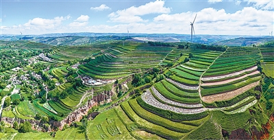 持续改善环境质量 在甘肃定西通渭县马营镇,经过系统治理,黄土高原上的层层梯田风景如画。 周修建摄(影像中国) |