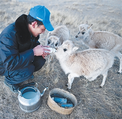 提升生态系统质量和稳定性 青海三江源国家公园管理局长江源园区可可西里管理处索南达杰保护站,巡山队员给被救助的藏羚羊幼仔喂奶。 新华社记者 张宏祥摄 |